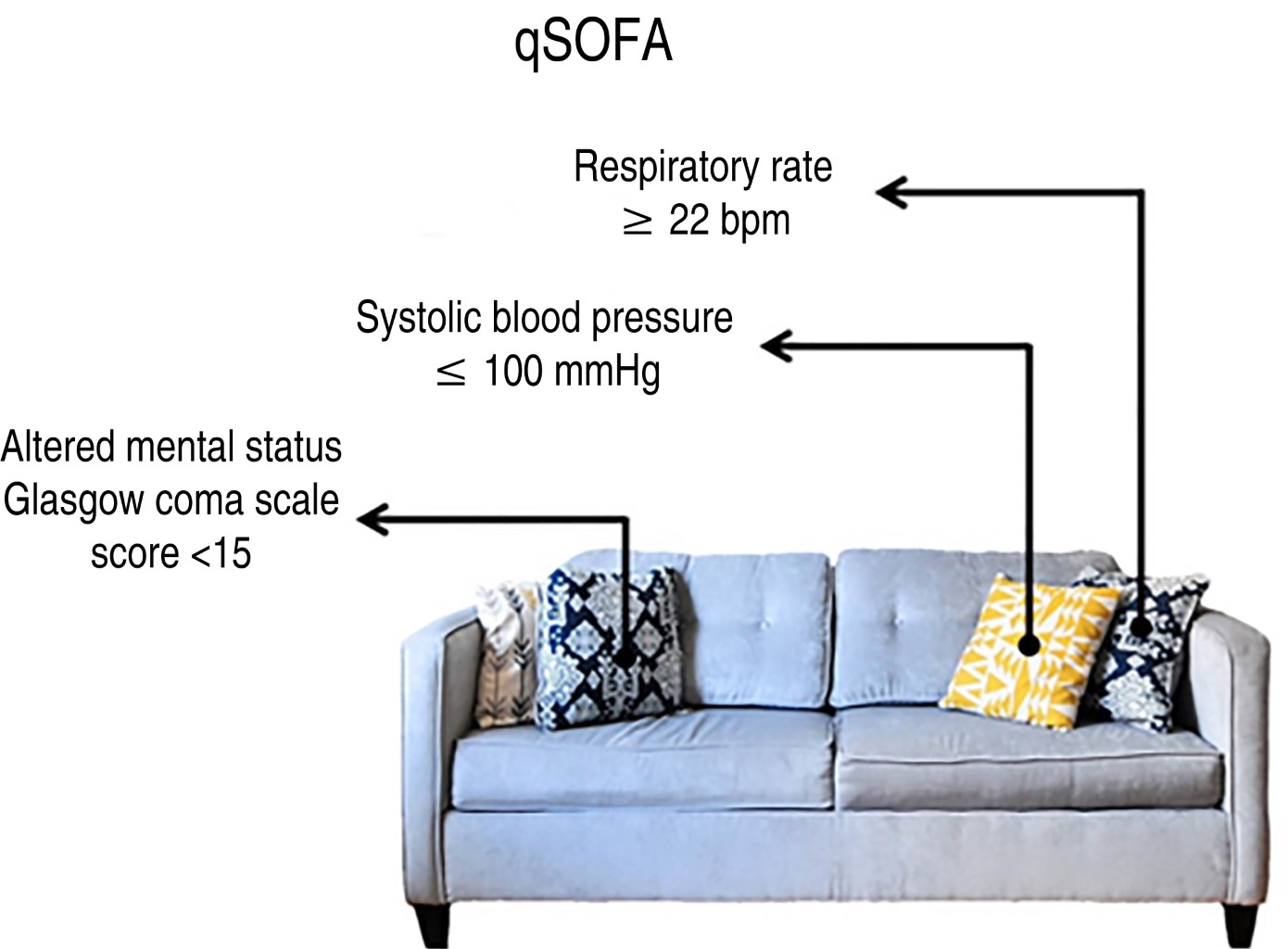 Originally sepsis was defined by the presence of an identified source of infection and systemic inflammatory response syndrome (SIRS). Subsequent organ failure is termed severe sepsis and SIRS due to cardiac and circulatory failure is termed septic shock.22 However, due to its low specificity and the SIRS criteria proving unsatisfactory in explaining many manifestations of sepsis, as it was recognized that organ dysfunction may be the first symptom observed, it has now been modified. In the third international consensus on the definition of sepsis and septic shock (Sepsis-3),23 specific sepsis is defined as a life-threatening organ dysfunction resulting from a dysregulated host response to infection. Organ dysfunction is measured by the Sequential Organ Failure Assessment Scale (SOFA) score; however, the SIRS criteria were removed from the definition and SOFA scale, and the authors of Sepsis-3 proposed the qSOFA (Figure 1) as a screening tool for sepsis with the following criteria: a) changes in mental status (Glasgow coma < 15), b) respiratory rate ≥ 22 breaths per minute, and c) systolic blood pressure less than 100 mmHg. An increase in score of two or more points is considered "life-threatening".