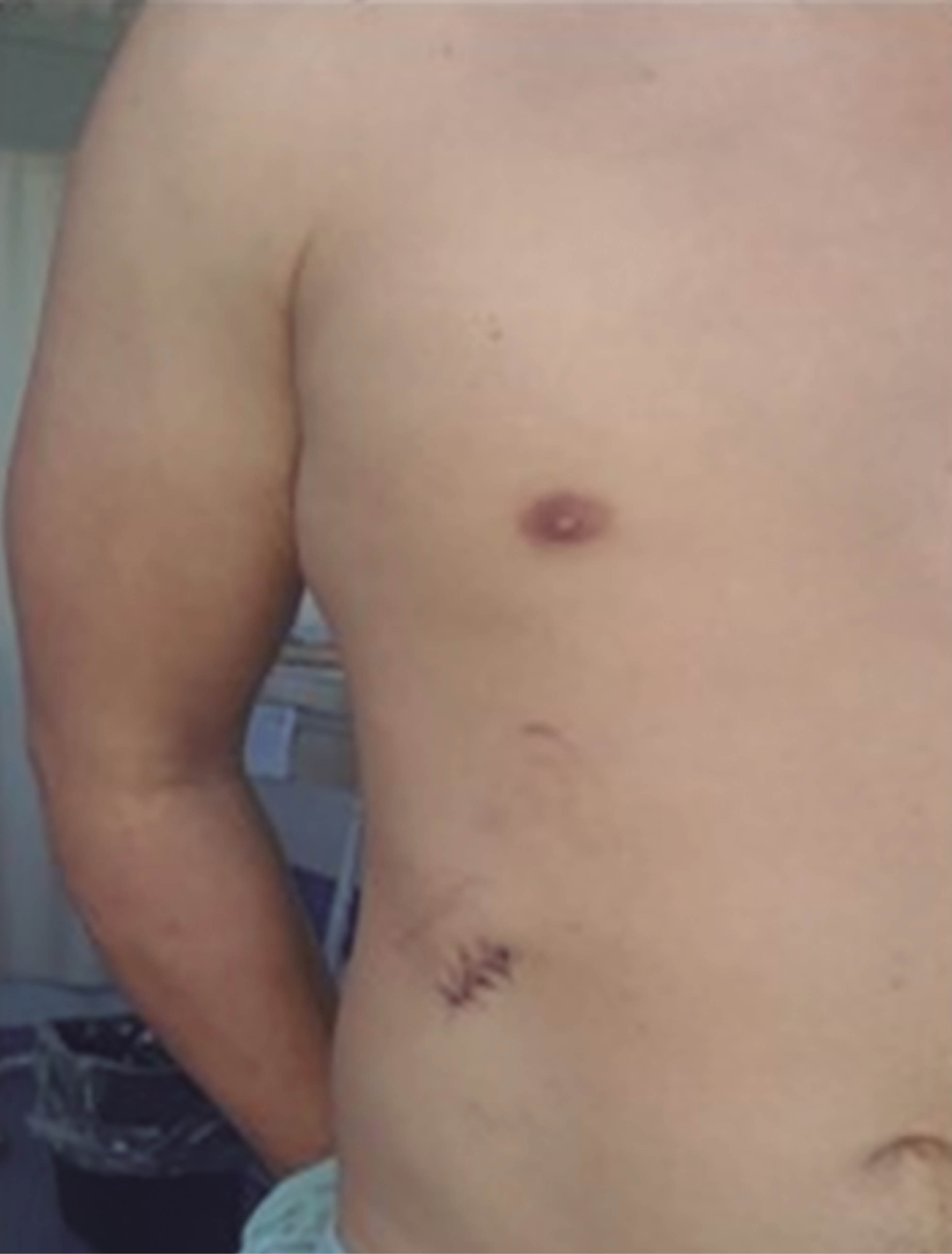 He arrived with a permeable airway saturating at 99%, Glasgow score of 15 points, blood pressure of 154/96 mmHg, mean arterial pressure of 101 mmHg, heart rate 92 x', temperature 36.5 °C, and shock index of 0.68. He has a right thoracoabdominal wound without active hemorrhage of 4 cm, as seen in Figure 1, with pain of 7/10 on the visual analog scale, pain on deep palpation in the right hypochondrium, as well as a 6 cm wound in the left upper extremity at the level of the middle third of the ulna, and a 4 cm of the middle third of the radius, without active hemorrhage; his radial and ulnar pulses were present.