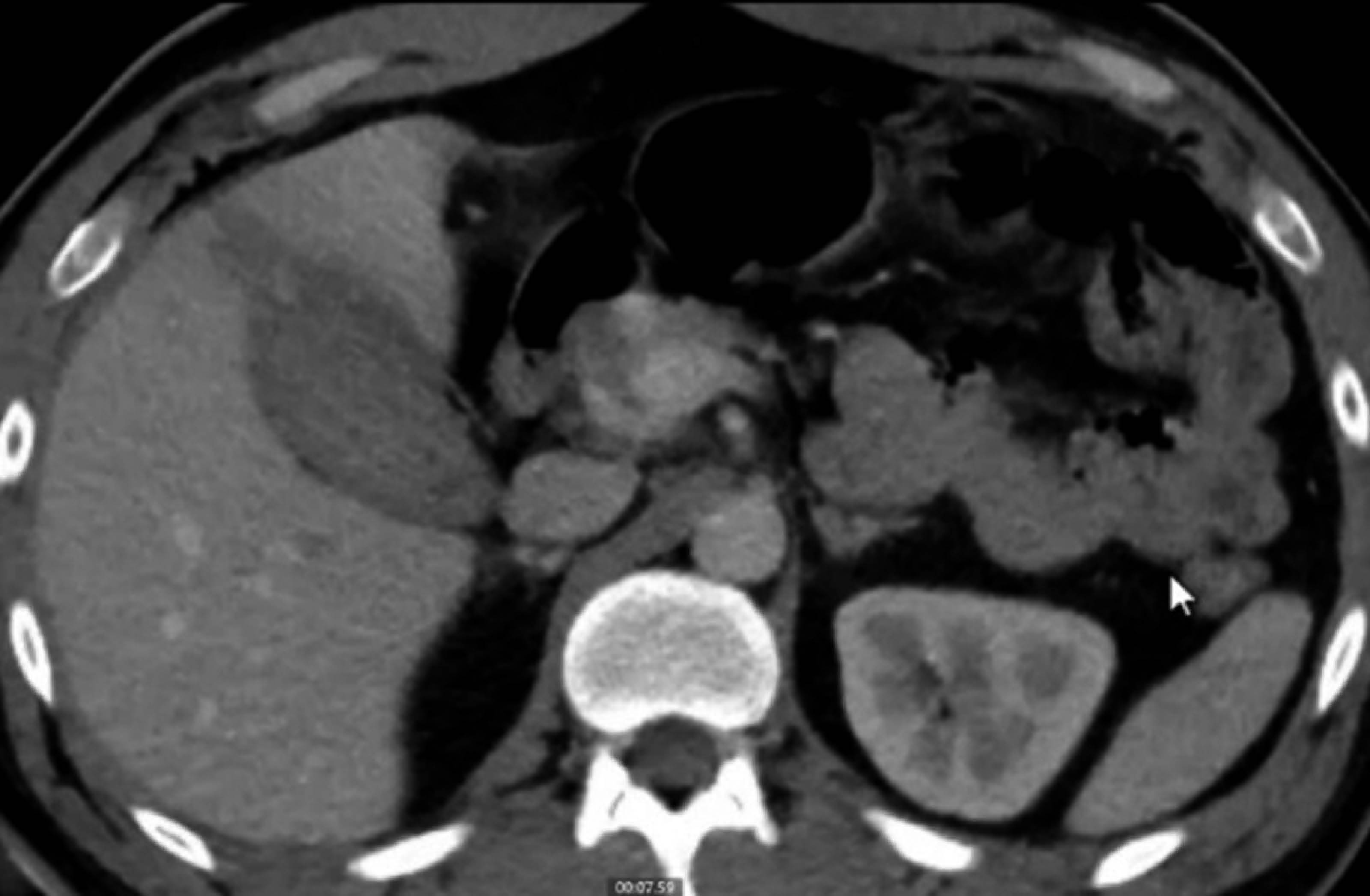 The first study available in our unit to rule out penetrating trauma and associated intra-abdominal injuries was an ultrasound, reporting a grade I liver injury 27 hours later, in addition to data of probable hemobilia. However, the gold standard study of choice is computed tomography.