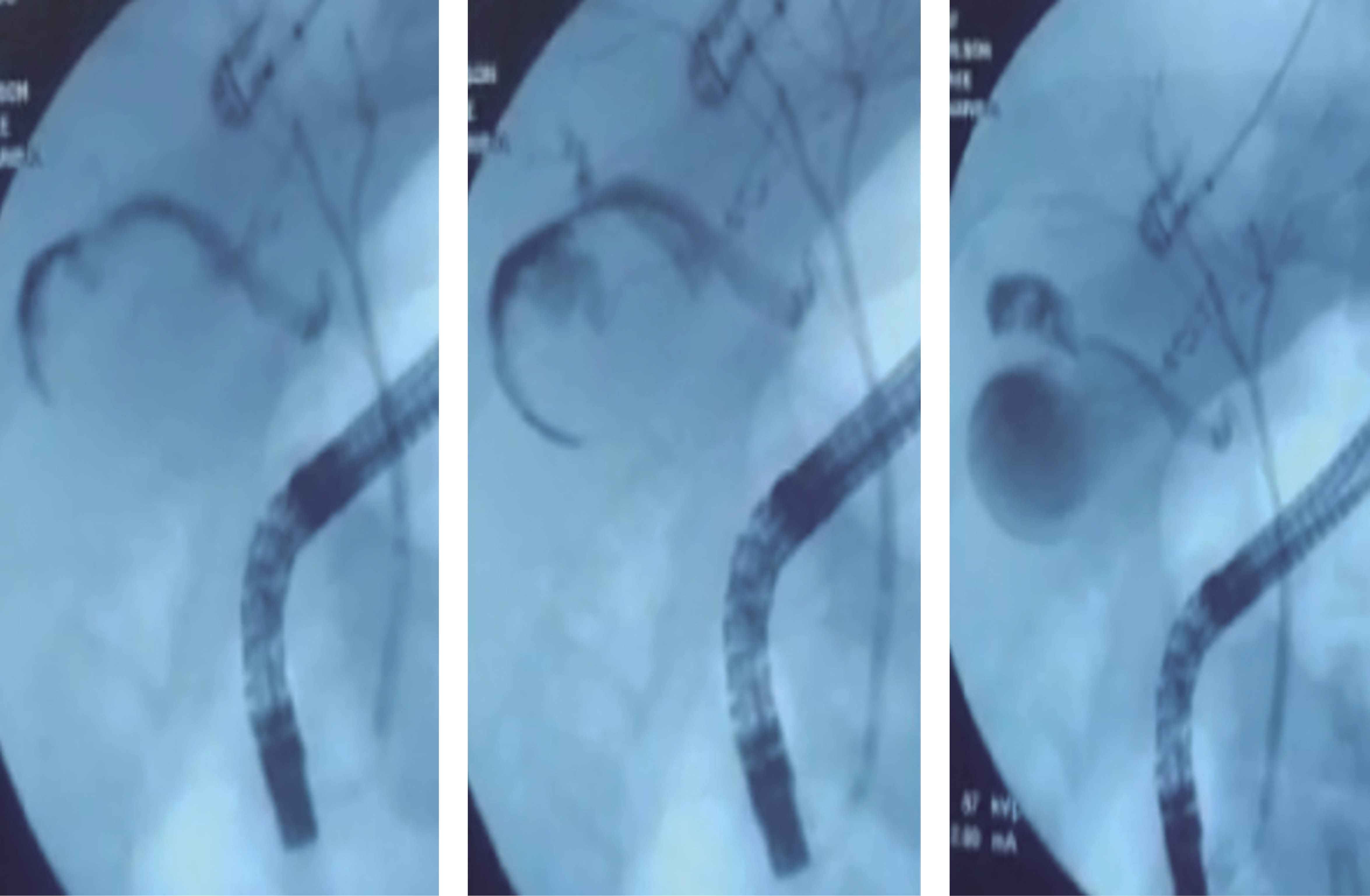 Following the study protocol, it was decided to start the oral route (four days and 15 hours later). An endoscopic retrograde cholangiopancreatography (ERCP) was performed that revealed a bile duct communicating to a small collection adjacent to the gallbladder (Figure 4). However, after a thorough review of the images, a disruption of the gallbladder wall adjacent to the hepatic parenchyma was observed, documenting the gallbladder lesion.