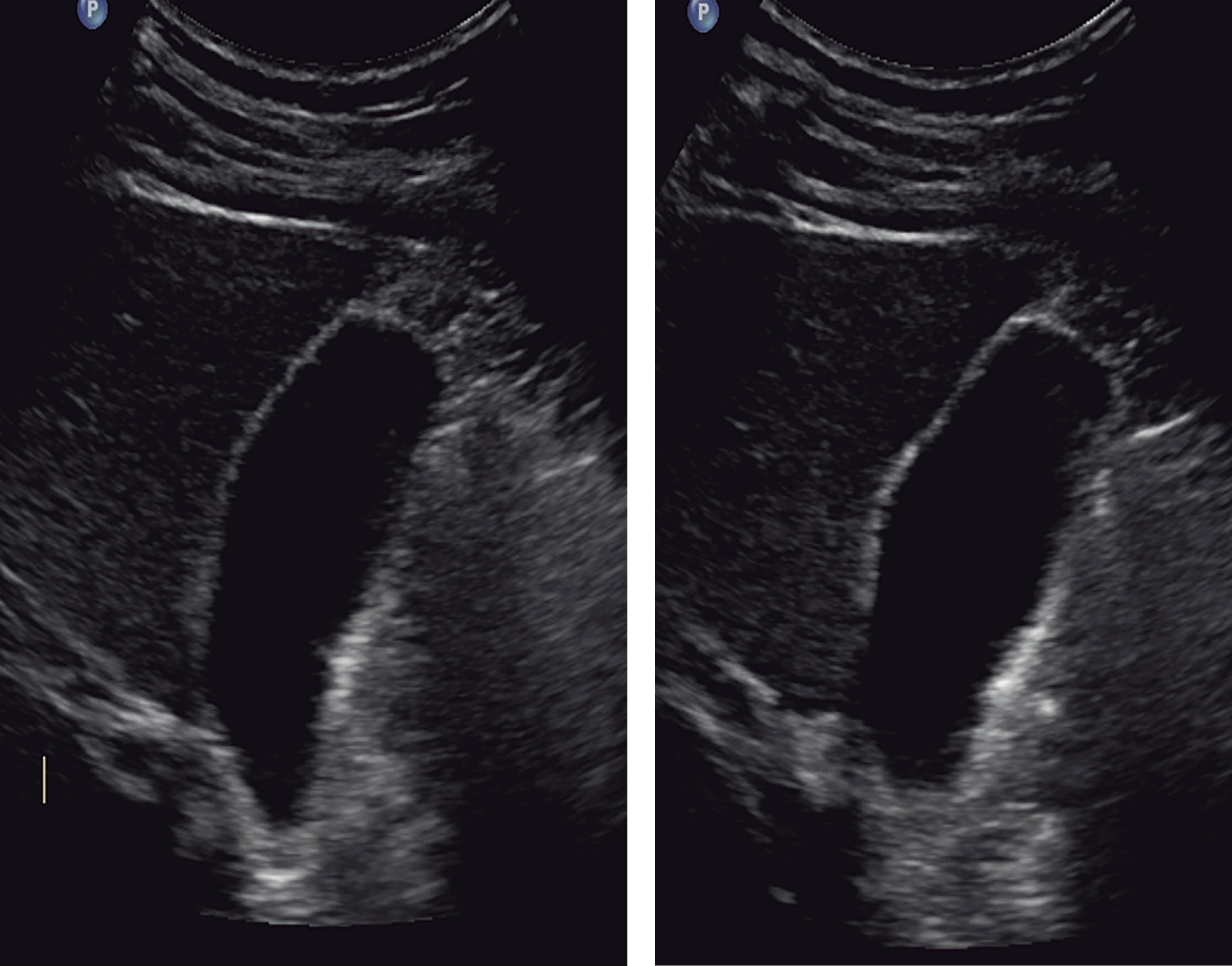 It was decided to continue surveillance and perform a control USG scan 27 hours later. It reported a 60 mm AAST (American Association for the Surgery of Trauma) grade I liver laceration in its longitudinal axis and a gallbladder, as described in Figure 2.