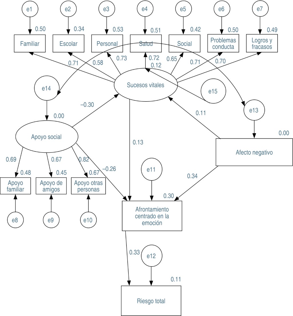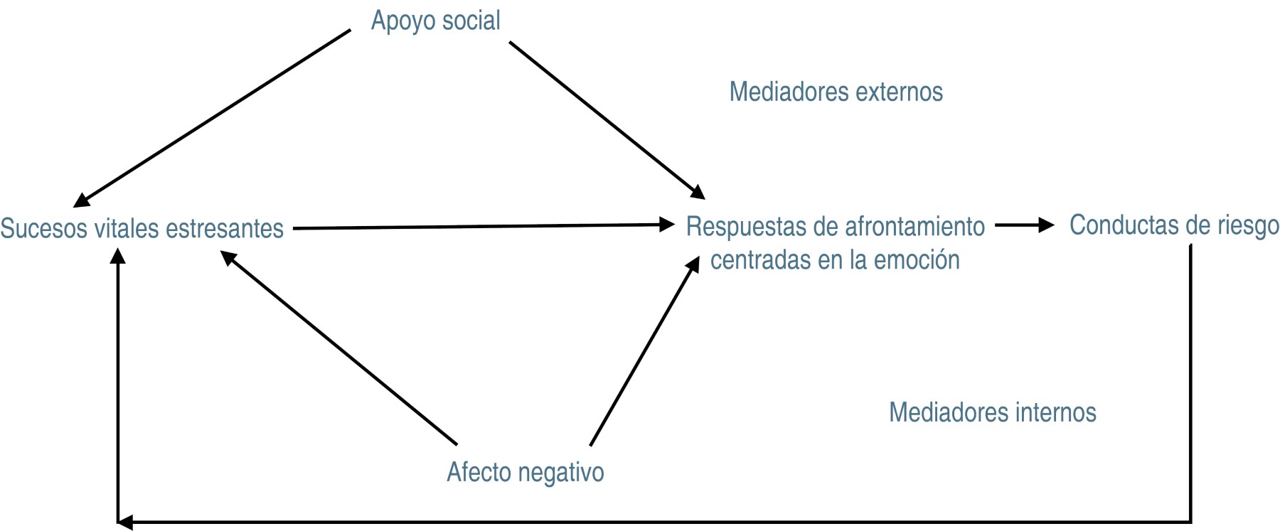 Results: 2,008 adolescents responded to the instrument. The results indicate that life events impact risk behaviors mediated by emotion-focused coping. In turn, life events and emotion-focused coping are modulated by variables related to affect and social support.