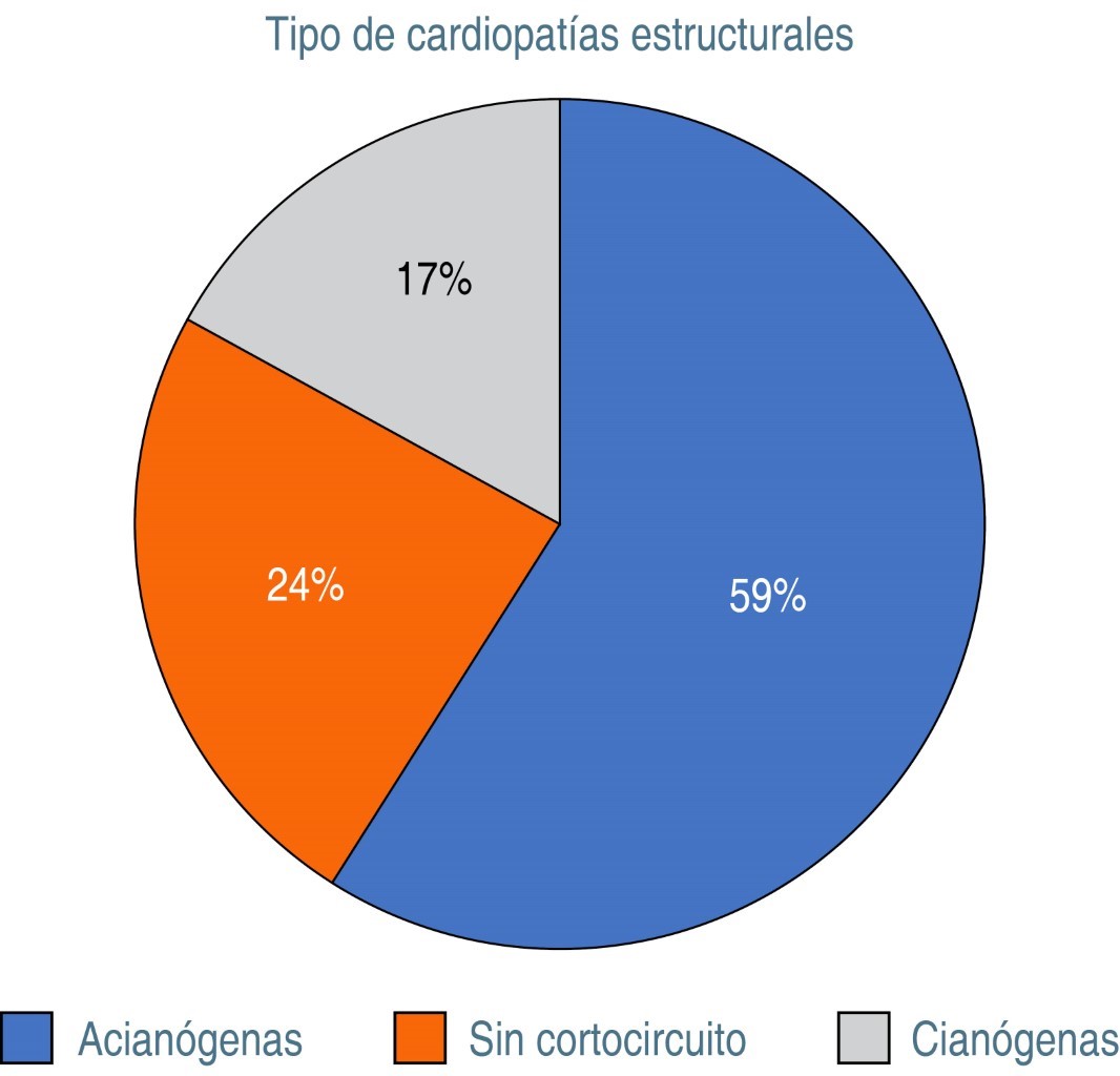 Results: the study included 1,848 patients, of whom 1,096 (59%) had no cardiovascular pathology; 634 (34.3%) patients had some type of structural heart disease. The most common type of CHD was acyanotic with increased pulmonary flow (32.4%), of which ventricular septal defect and patent ductus arteriosus were the most frequent.