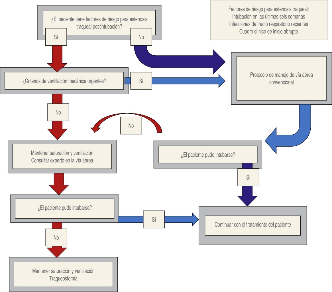 Postintubation tracheal stenosis is a known complication of prolonged mechanical ventilation. It is a frequent cause of tracheostomy, resection, or reconstructive surgery of the trachea. Treatment of these patients is difficult, especially if their presentation jeopardizes the permeability of the airway. We present the case of a patient with acute respiratory acidosis due to tracheal stenosis and a concomitant asymptomatic infection of COVID-19. Medical record of 5 days of mechanical ventilation for a traumatic brain injury a month before. A tracheostomy was performed with a good clinical outcome.