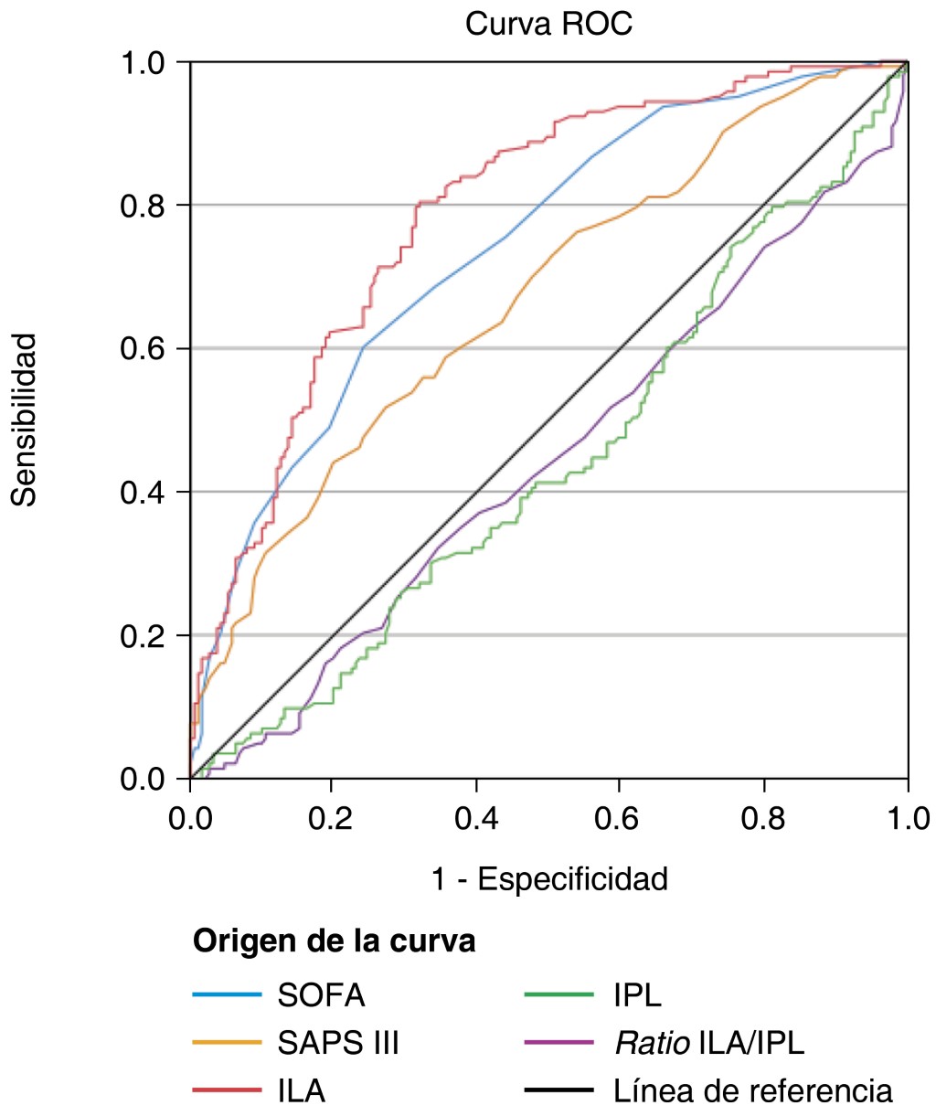 Results: we analyzed 334 patients with a diagnosis of septic shock, 190 (56.9%) male patients, with a mean age of 69.6 ± 14.1 years. An AUC 0.790 was found for ILA (CI95% 0.742-0.838); 0.441 for IPL (CI95% 0.379-0.503); 0.742 for SOFA (CI95% 0. 690-0.795); 0.669 for SAPS III (CI95% 0.611-0.727); and 0.444 for ILA/IPL ratio (CI95% 0.381-0.506).