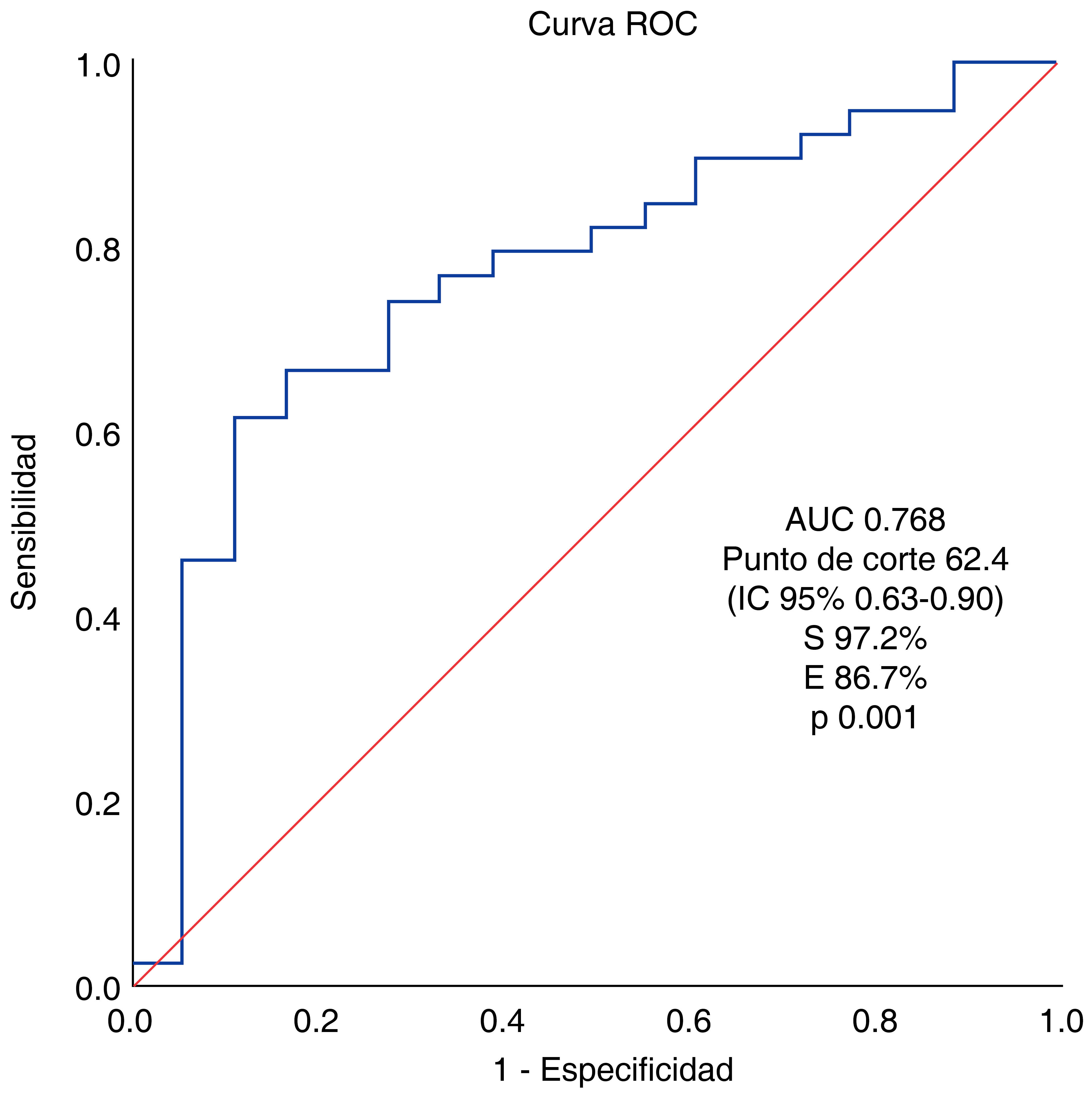 Results: 57 records were analyzed, with ages ranging from 15 to 43 years with a mean of 32 years, finding an area under the curve (AUC) of 0.768 (95% CI: 0.63-0.90) for the cut-off point of 62.4, sensitivity of 97.2% and specificity of 86.7%, P 0.001 and an estimated risk of 4.7 (95% CI: 0.40-56.1).