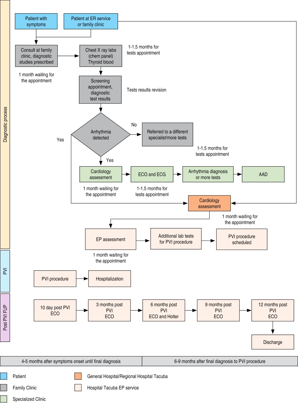 The most common routine referral was made through an institutional medical referral system, where the patient entered the Health System through evaluation by the general practitioner in a primary care Medical Unit, where symptoms were documented, and diagnostic studies were extended to corroborate the presence of AF. Subsequently, having these studies, the patient was sent to the second level of care, provided by the Cardiology and Cardiac Electrophysiology services, where a specific diagnostic protocol was performed with ambulatory electrocardiographic monitoring and echocardiogram if required. Once the diagnosis of AF was confirmed and the criteria to be a candidate for ablation procedure were met, the patient was scheduled for PVI.