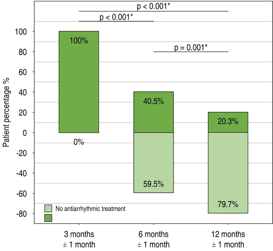 A significant decrease in the percentage of patients on antiarrhythmic treatment was observed, indicating that cardiac ablation via PVI reduces the use of antiarrhythmic drugs for AF treatment.30-32