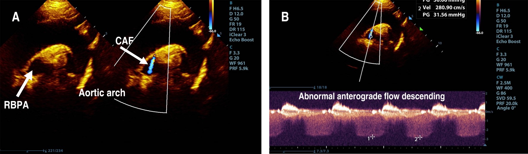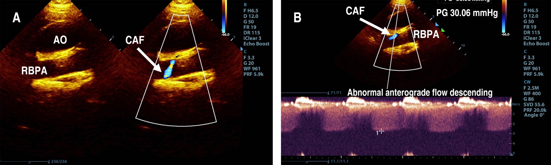 The parasternal short-axis view of the aortic root showed the right coronary artery (RCA) and left coronary artery (LCA) in their appropriate anatomical positions, with the proximal segment of the RCA exhibiting a Z score of 0.2 (Figure 1). However, the suprasternal longitudinal view identified an abnormal vascular structure with anterograde flow descending into the right branch of the pulmonary artery (RBPA) (Figure 2). The suprasternal short-axis view illustrated an anastomosis at the proximal segment of the RBPA, characterized by continuous, pulsatile flow, a maximum recorded velocity of 2.8 m/s, and a maximum gradient of 31 mmHg (Figure 3).