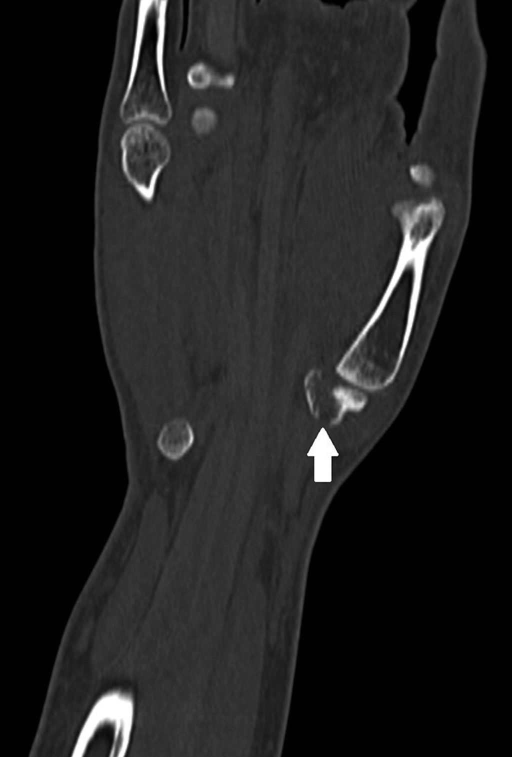 An anteroposterior incidence performed with the hand in full pronation allows visualization of the trapezium and the base of the first metacarpal. CT, the gold standard for fractures, and bone scintigraphy are used to assess displacement and fragment size, especially in fractures not evident on plain radiographs. MRI is effective in identifying radiographically occult radiocarpal fractures.7,8