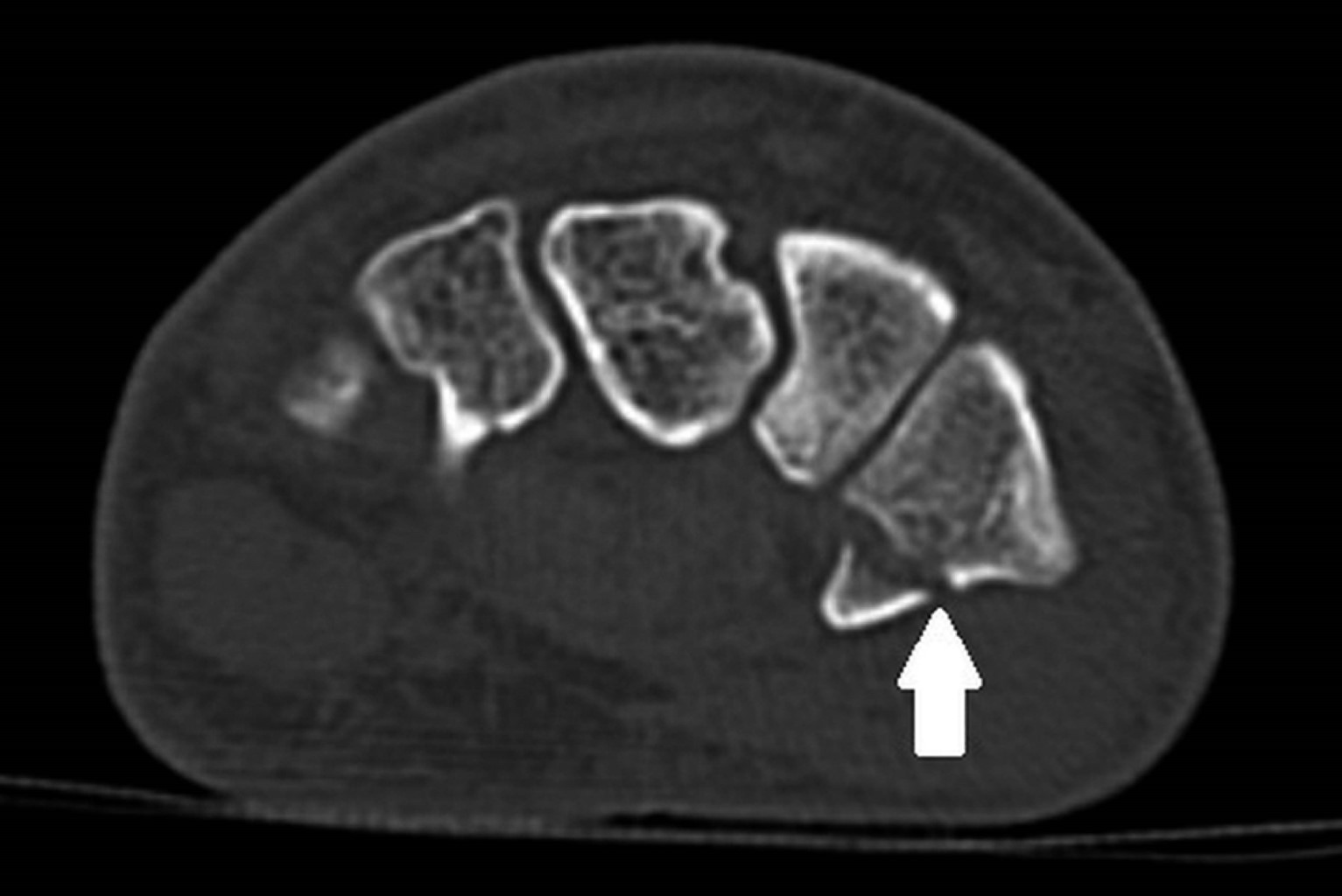 Trapezium fractures can be managed conservatively or surgically. Trapezium tuberosity fractures can be treated with thumb spica cast immobilization for four to six weeks. Type 2 fractures have a smaller avulsion fragment with rupture of the anterior oblique ligament (AOL) and a higher incidence of symptomatic nonunion. For these cases, there is the possibility of early operative excision of symptomatic Type 2 lesions.2,4 When there is a hamate body fracture, surgical intervention is necessary for significant, unstable displacement or fractures compromising carpometacarpal joints. The surgical goal is to restore a stable joint, with special attention to the 4th and 5th carpometacarpal joints. Closed reduction and percutaneous Kirschner wire fixation can be effective for selected hamate body fractures with minimal comminution or to maintain alignment of unstable hamatometacarpal joints.9 As a limitation of our study, MRI was not performed since the diagnosis was already made by CT.