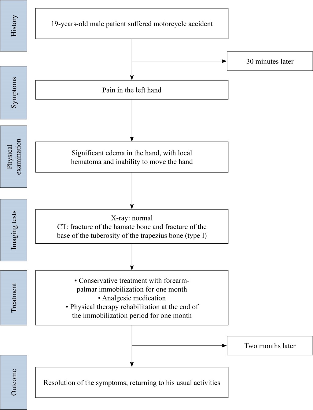 The patient received analgesic medication and immobilization with a forearm-palmar immobilization for one month followed by two months of physiotherapy. At the end of the four-month treatment, the patient exhibits normal mobility and pain-free, returning to usual activities. The patient's course is summarized in Figure 4.