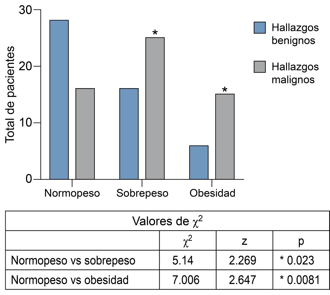 Introduction: obesity is positioned as the main modifiable risk factor for breast cancer. The objective of this study is to find an association between breast cancer and obesity in the Mexican population. Material and methods: an observational, cross-sectional, and analytical study was carried out in the Radiology and Imaging department of the Angeles Mocel Hospital. Results: information was collected from medical records that required a breast biopsy, and two study groups were established, the first with benign findings and the second with malignant findings. Conclusion: there are statistically significant differences in obesity and patients with breast cancer in our population.REFERENCES