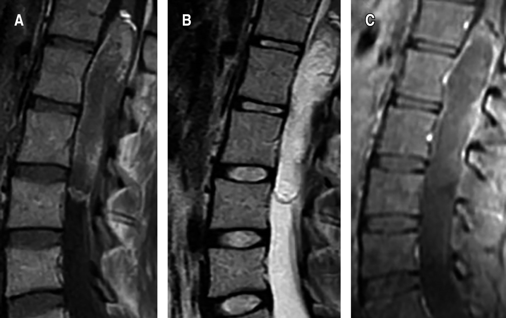 Female patient, 26 years old, with a history of pain in the right pelvic member of six years of evolution, with progressive claudication, repeated urinary tract infections, emergency urinary incontinence, admission to the emergency service, with an incidentally finding an intramedullary cyst from the vertebral body T12 to L3, with heterogeneous enhancement with intravenous contrast (Figure 1). Surgical resection was performed with neuro monitoring and posterior approach, laminectomy of L1 and L2, with the finding of an intradural extramedullary encapsulated macroscopically with pearled appearance, dismissable consistency, and easily resectable. Satisfactory macroscopic resection was performed, leaving a small remnant attached to the medullar cone (Figure 2). The histopathological report of the lesion was abundant keratin, compatible with a dermoid cyst (Figure 3). The patient left the hospital two days after the procedure, without sensory or motor deficit in the lower limbs, in follow-up at 2 weeks showed improvement in urinary incontinence. Postoperative magnetic resonance imaging was performed where a small remnant is observed at the level of the spinal cord cone (Figure 4).