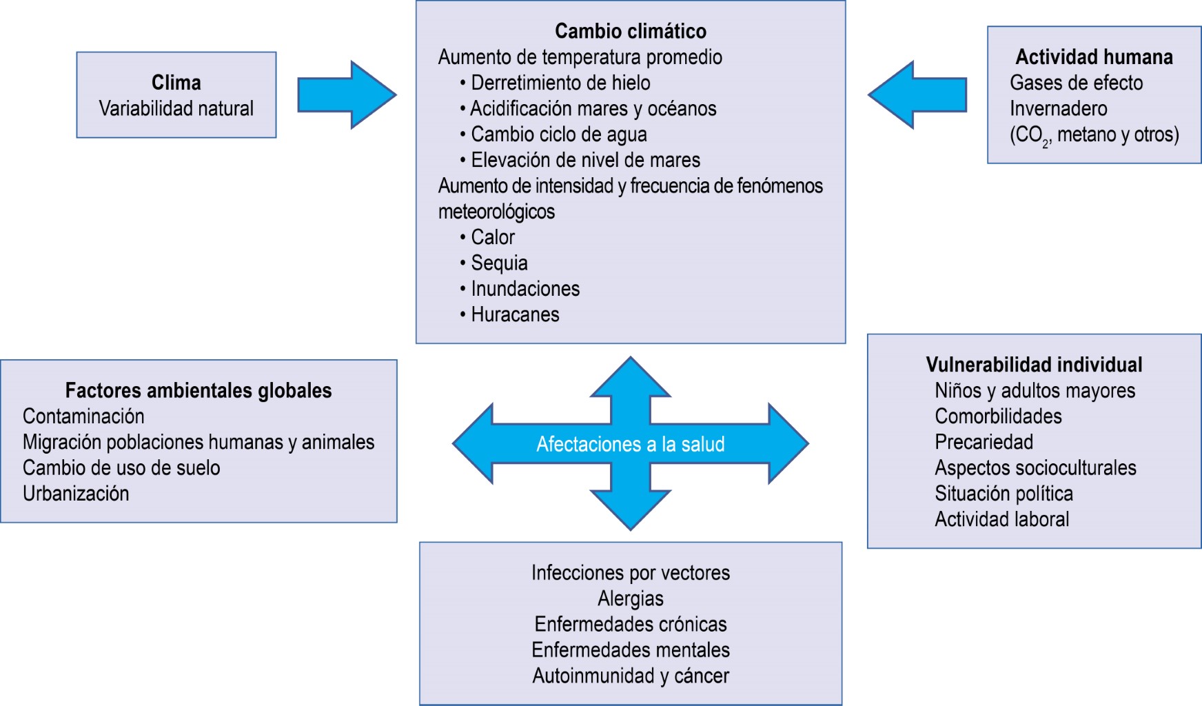 The elements that characterize, generate and exacerbate climate change are comprehensively analyzed, emphasizing aspects of impact on health, but above all the conditions that can be useful to implement corrections.