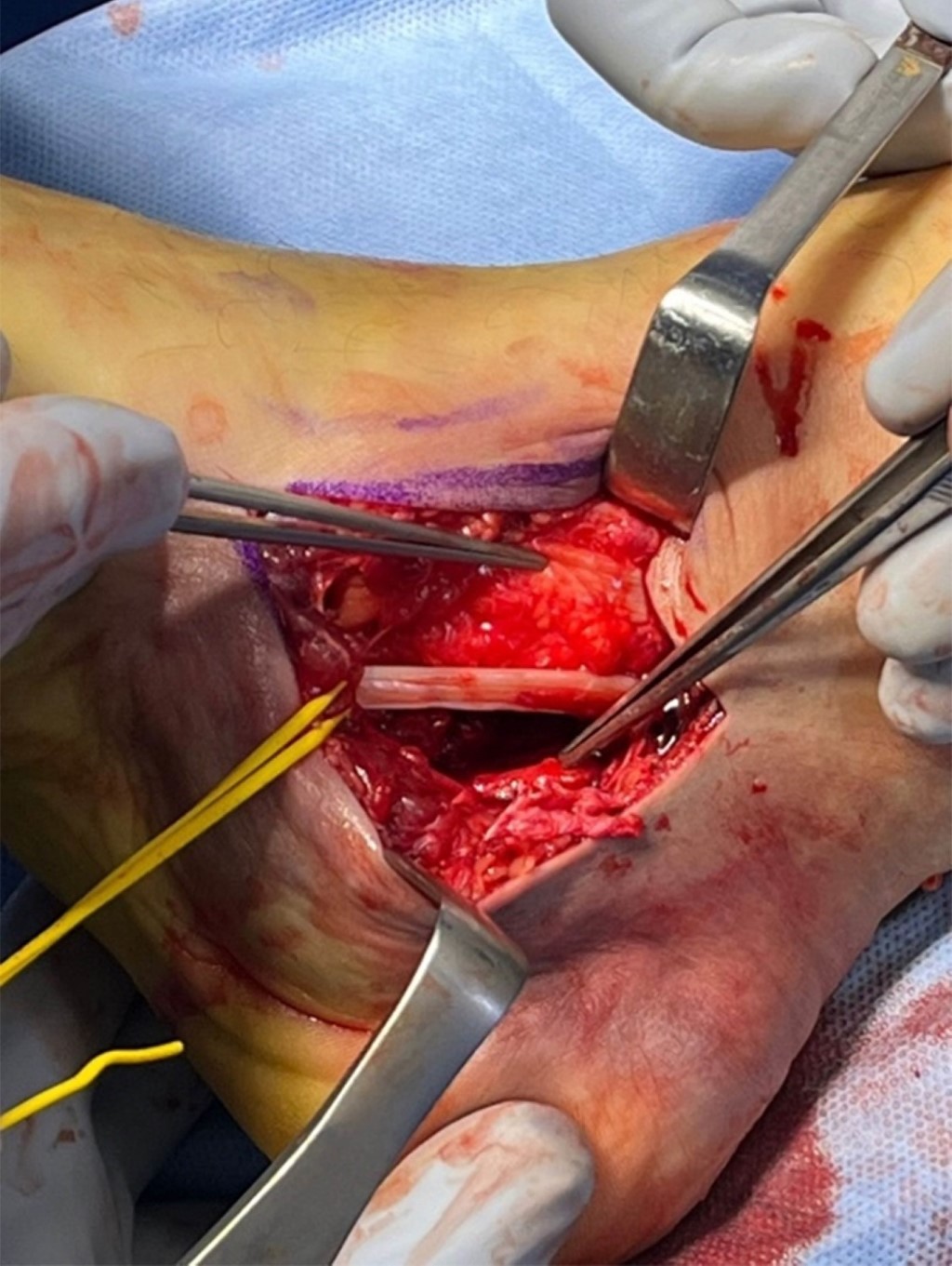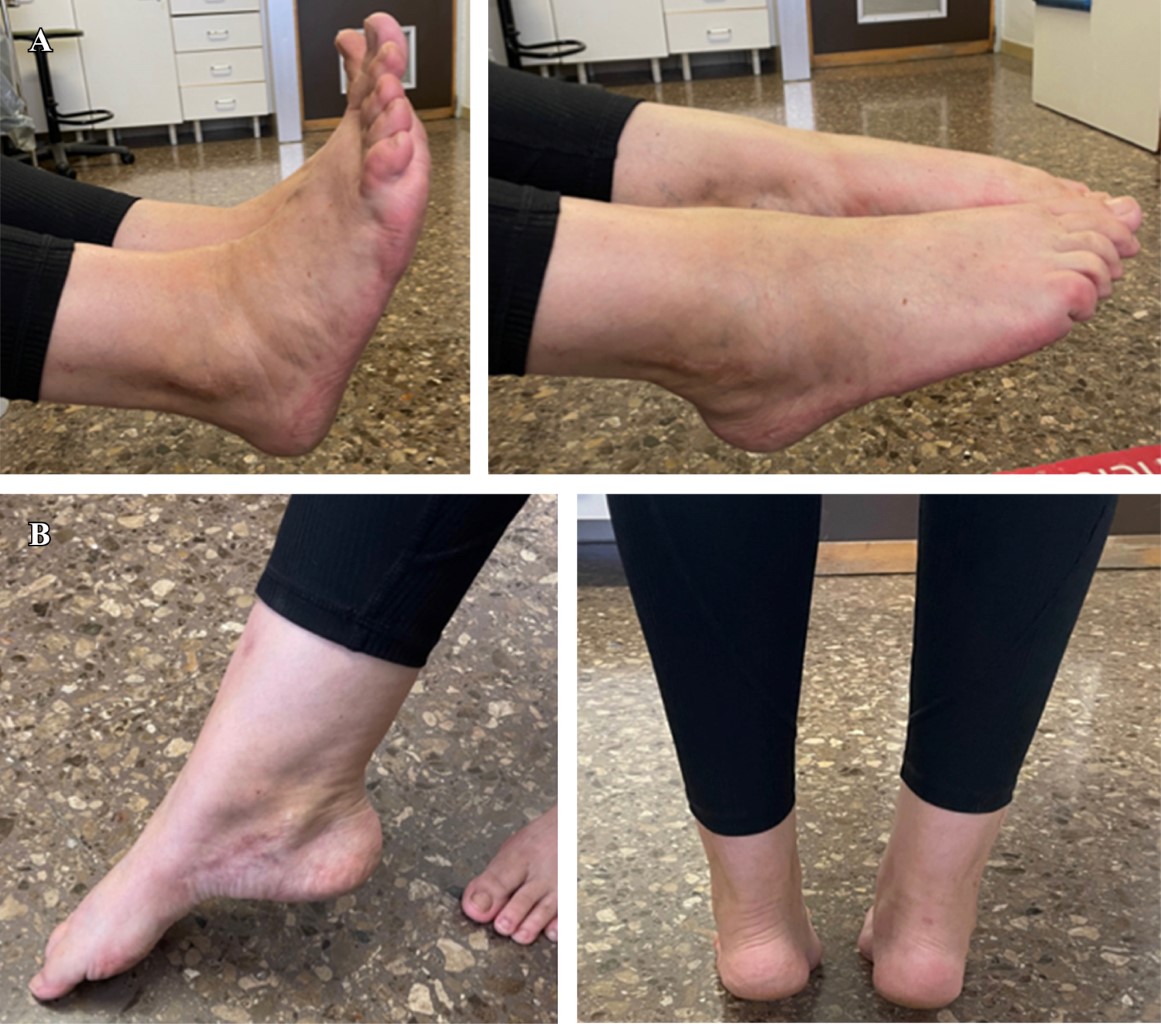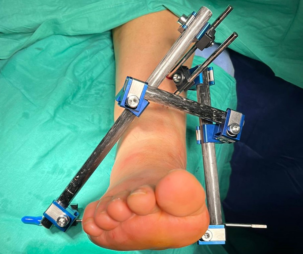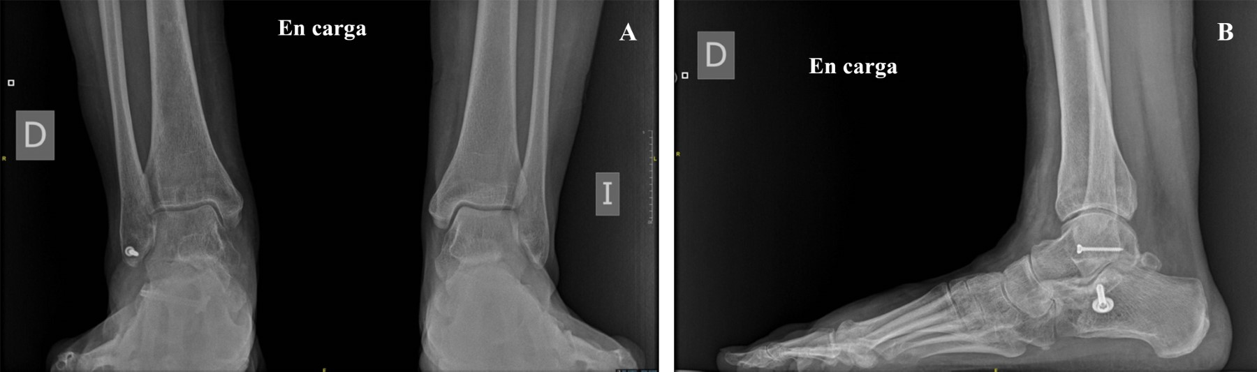 Clinical case: a 46-year-old woman fell from a height of 3 meters, with severe deformity in the hindfoot. There was good distal vascular coloration, but no pulse or posterior tibial sensitivity could be identified. In addition, she had a medial sulcocutaneous fold under the head of the talus. Plain radiograph and CT revealed lateral subtalar dislocation, with fracture of the sustentaculum tali, and a "fleck sign" in the posterior region of the distal fibula. Suspecting soft tissue incarceration, a medial approach was performed, observing interposition of the posterior tibial neurovascular bundle. After joint reduction, the sustentaculum tali and the "fleck sign" were osteosynthesized. In addition, a complete section of the long lateral peroneal tendon was identified, which was tenodesed to the short peroneal tendon. Finally, an external fixator was placed. After eight weeks, the fixator was removed and weight bearing was authorized; after six months, mobility was complete and hypoesthesia persisted only in the plantar pad.