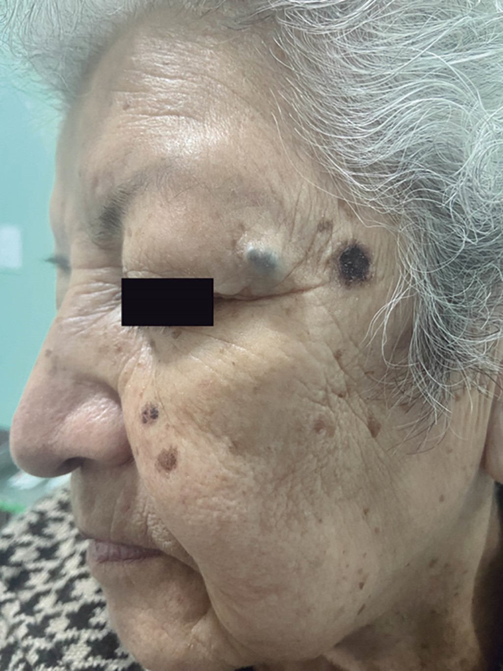 Spiradenoma is a benign, yet rare, tumor arising from eccrine sweat glands, which mainly affects people between the second and fourth decades of life and represents a clinical and pathological diagnostic challenge. It commonly presents as a nodular, blueish-pink to gray tumor, usually in the upper half of the body. Since no standardized guidelines exist for the management and follow-up of spiradenoma, surgical excision is recommended in the context of non-specific long-standing lesions, particularly in patients older than 50 years. In this article we report the case of a 79 years-old female patient with a spiradenoma in the left upper eyelid, which is an unusual location.