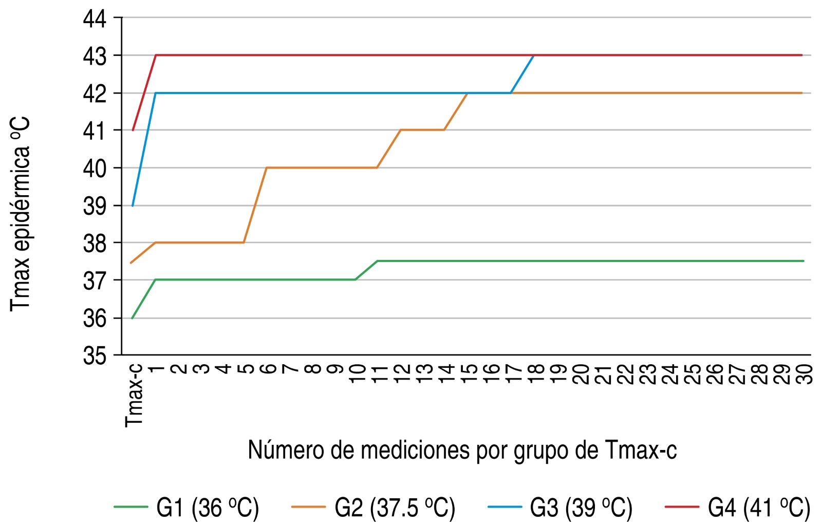 ® device and to define the maximum cutoff temperature and its safety range in relation to the maximum epidermal temperature. 30 participants were included; 4 maximum cutoff temperature levels were assessed in the infraumbilical skin to stop radiofrequency: in groups G1 (36.0 °C), G2 (37.5 °C), G3 (39.0 °C) and G4 (41.0 °C). Radiofrequency was applied of 48 W power using the DORIAN