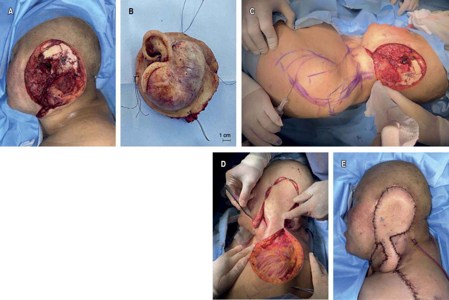 The supraclavicular flap is a viable alternative for head and neck reconstruction in patients who are not suitable for microsurgical procedures, because of poor clinical condition or high oncologic recurrence risk. It provides great skin color and texture match to the recipient areas, as well as minimal donor site morbidity. We present a case of immediate reconstruction of a 13 × 12.5 cm defect in the temporomandibular region, following resection of recurrent differentiated embryonal rhabdomyosarcoma. A ipsilateral pedicled supraclavicular flap was used, with satisfactory clinical and aesthetic outcomes.