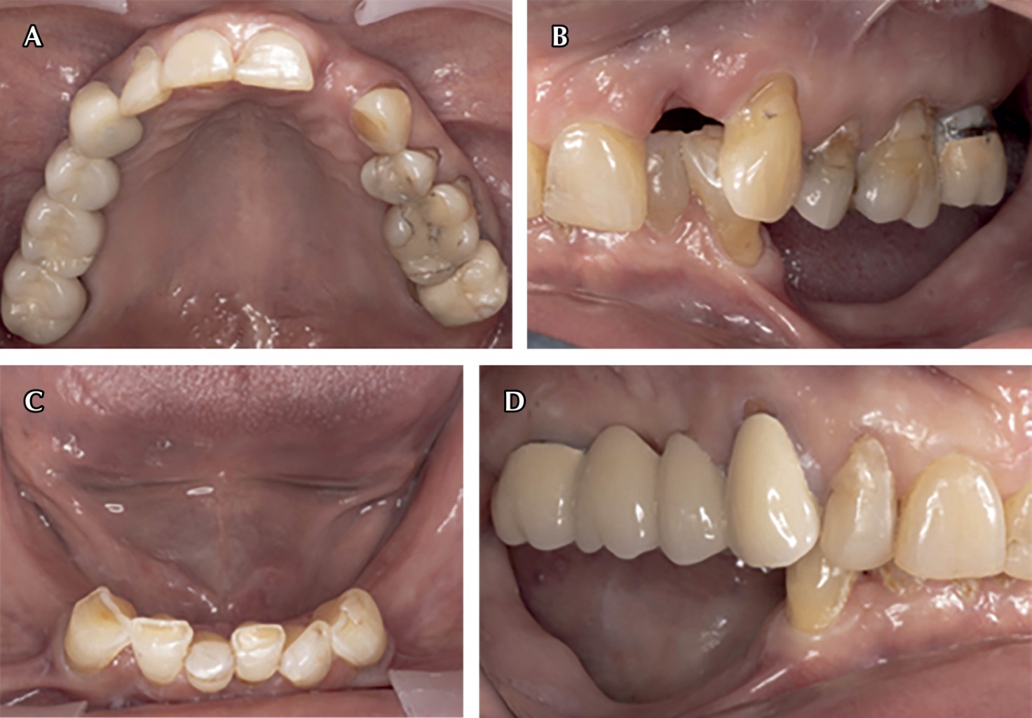 Bisphosphonates are synthetic analogue drugs of pyrophosphates that have a high antiresorptive potency in the bone remodeling cycle. They have in their chemical structure a carbon atom which remains linked to two phosphate groups (P-C-P), their negative charge explains the affinity they have for bone tissue. This clinical report presents the treatment of a patient with a history of osteoporosis, who, due to the use of removable partial dentures in poor condition, caused severe atrophy of the alveolar ridge. Currently, he is prescribed zoledronic acid (bisphosphonates). The placement of dental implants and extractions is contraindicated in patients on bisphosphonate treatment, so an alternative treatment is chosen that consists of a removable polyoxymethylene partial prosthesis and a four-unit bridge with an endocrown-type posterior abutment design. After one year, with 11 months of use of the new fixed prosthesis, the patient did not present dislodgement of the bridge, no occlusal problem was observed, with no absence of increase in the resorption of the edentulous alveolar ridge in the maxilla and mandible, the treatment gave great results both for the general health of the patient and to meet her expectations.