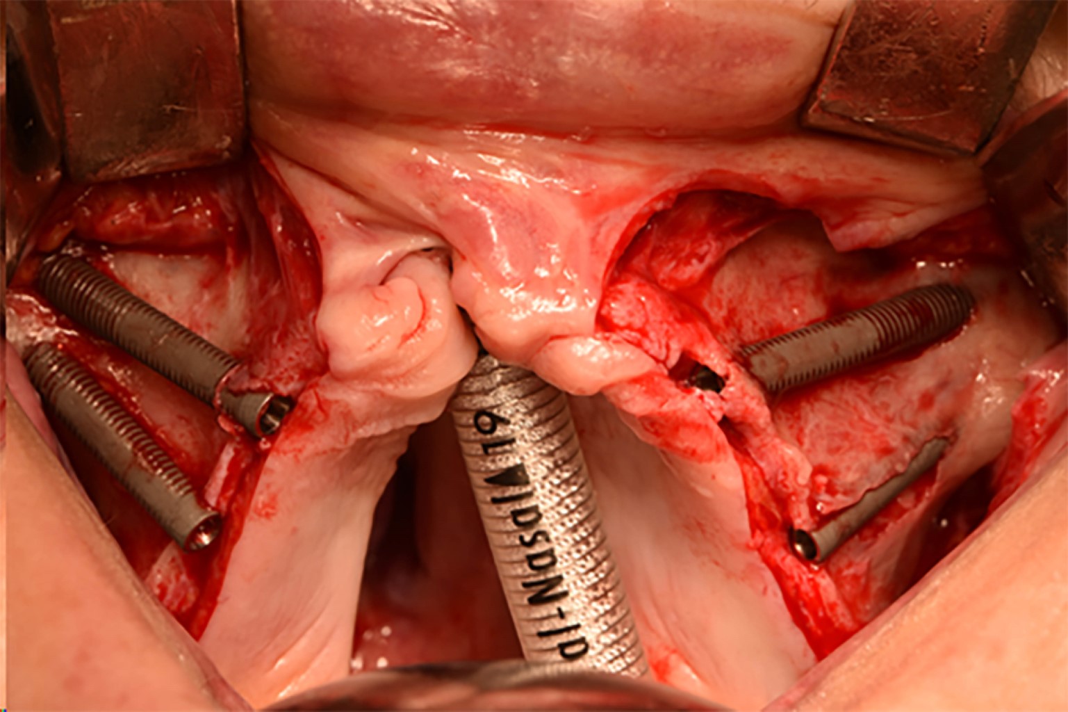 Under general anesthesia and nasotracheal intubation, four Zygoma GMTM Neodent implants with a diameter of 4.0 mm with Grand Morse connection were placed, the Slot technique was used according to the milling protocol of the commercial house, at the level of 16, 13 and 26, implants of 40 mm long and at the level of 23 a 45 mm long implant; all with adequate primary stability (insertion torque greater than 45 Nw/Cm during placement of all implants) (Figure 4). Finally, the respective covers were installed. Bichat ball implants were covered bilaterally and closure was performed by first intention with 3/0 Vicryl suture.