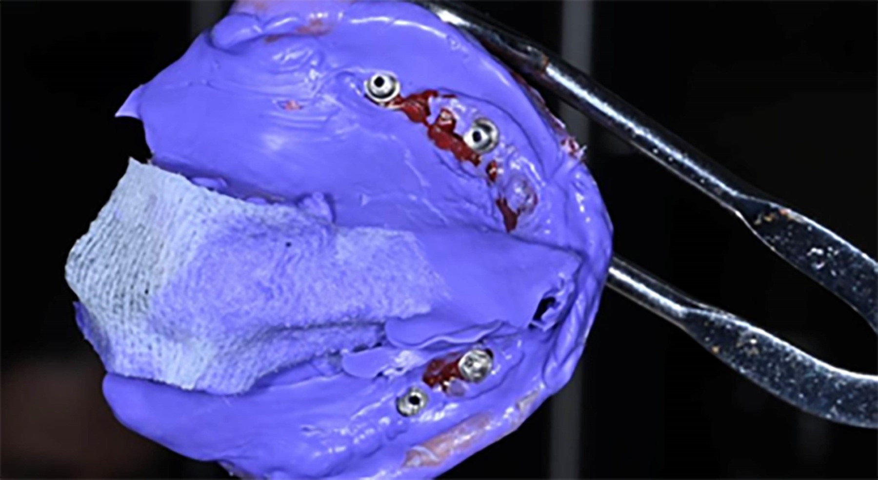 The tray is tried in the mouth ensuring adequate visibility of the screw, a layer of adhesive is applied and waited for five minutes. A sterile gauze pad is positioned in the depth of the palatal defect to avoid excessive displacement of the material and an impression is taken with silicone of regular consistency. Finally, a master model is obtained with the exact position of the implants (Figure 6) and a Hader bar is manufactured in titanium, taking as reference the previously made tooth filing for the temporary prosthetic obturator (Figure 7).