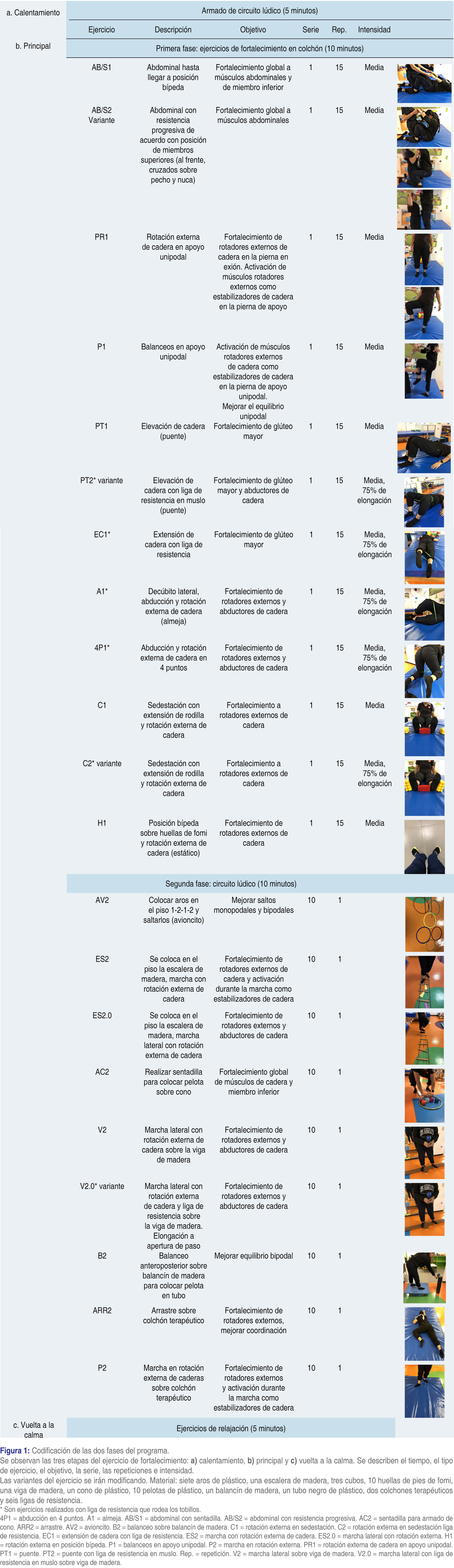 Introduction: lower limb postural defects in children have a frequency of 34-50% and internal hip rotation is 46% of the total. The objective of the study was to determine the response to rehabilitation treatment in children aged three to five years with internal hip rotation. A series of cases is presented (11 Mexican patients) with internal hip rotation who received rehabilitation treatment based on a strengthening and recreational circuit program consisting of 21 exercises, twice a week (16 sessions). The results were evaluated with the Staheli profile, the modified Daniels scale and the Denver scale.