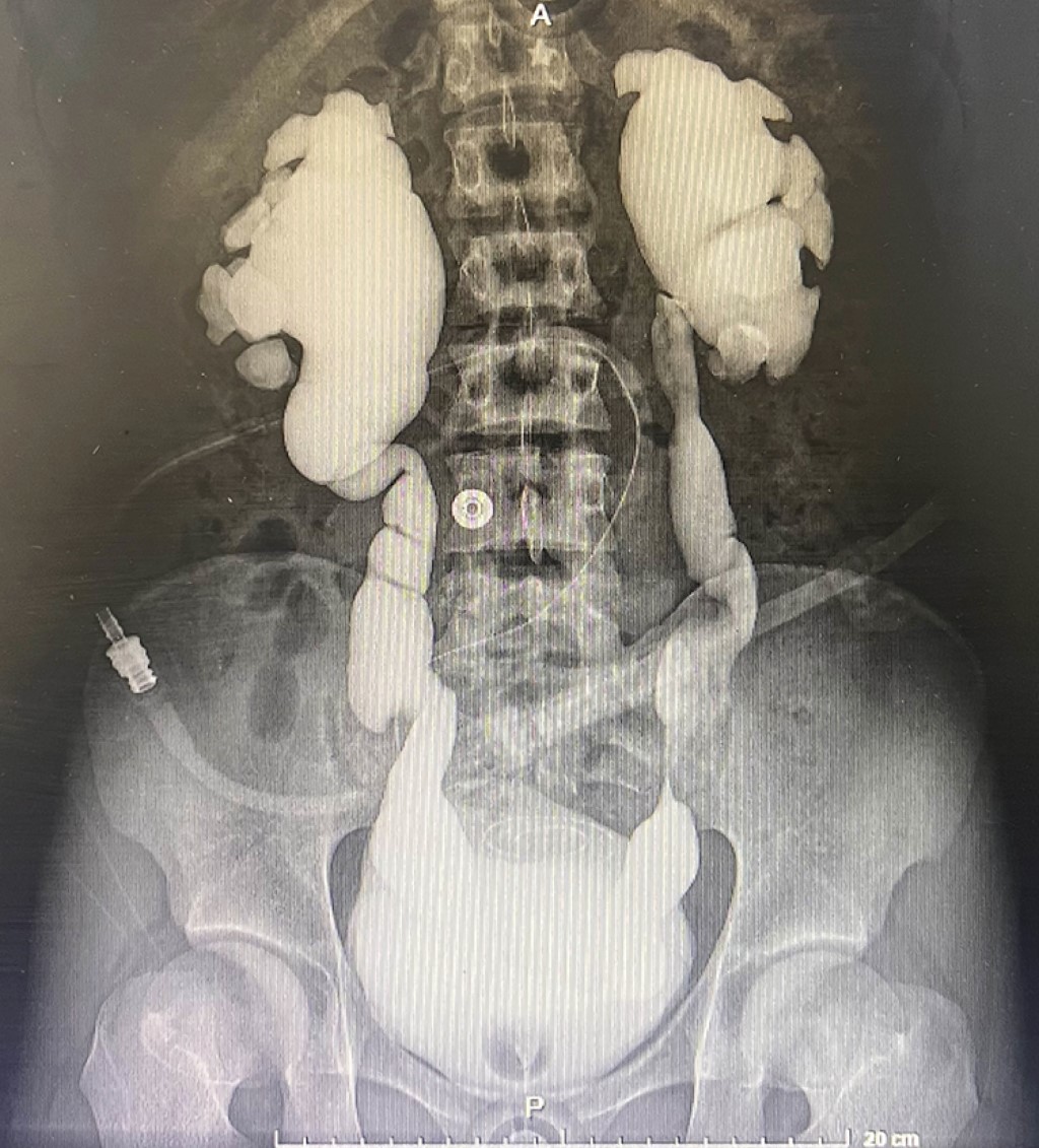 A bilateral transperitoneal laparoscopic nephroureterectomy was performed on pre-transplant natives through five ports with a change in modality from peritoneal dialysis to renal replacement, removing the Tenckhoff catheter through a mid-infraumbilical wound for the extraction of both native kidneys and placement of a Mahurkar catheter. Surgical time: 180 min, intraoperative blood loss 100 mL, hospital stay: 48 h. After 30 days, living donor kidney transplant performed, warm ischemia 4 min, cold ischemia time (CIT) 91 min, uremia. Discharged on the fifth postoperative day. Serum creatinine (Cr) 1 mg/dL, hemoglobin 6.7 mg/dL without transfusion requirement, maintained transurethral catheter at home for four days until urinary volumes decreased and intermittent bladder catheterization program was restarted. Follow-up four months post-transplant: Cr 1.14 mg/dL, hemoglobin 14.1 mg/dL.REFERENCES