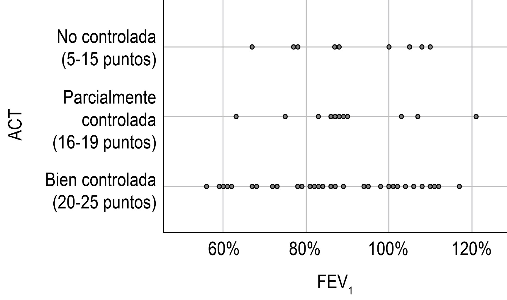 Results: a total of 60 patients were analyzed (78.3% women, 21.7% men), with a mean age of 51.6 ± 13.53 years (median age 51.5 years, minimum 18 years, and maximum 82 years). Median ACT scores was 21 points (minimum 11, maximum 25 points), and median FEV