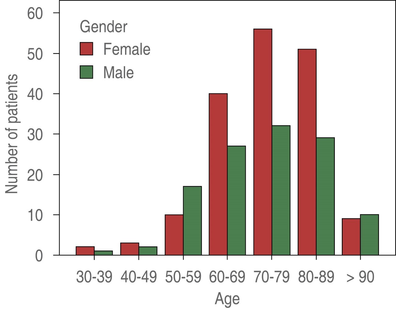 When comparing the average age by gender, men had a mean age of 72.5 ± 11.80 years, and women had a mean age of 74.0 ± 11.01 years, with no statistically significant difference (p = 0.144). In this study, the female-to-male ratio was 1.5:1, despite PD generally being more prevalent in males,18,19, 20 our study found that females were more likely to suffer from PD than males. This difference is likely related to the fact that more women attended the NRI-LGII during the period evaluated.