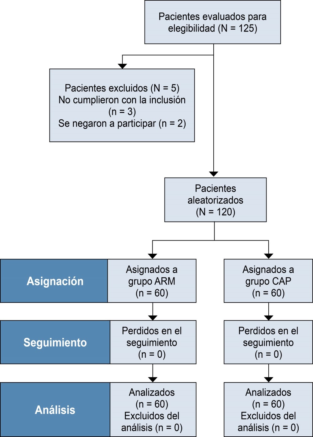 Material y methods: a randomized, double-blind clinical trial was conducted with 120 patients aged 18 to 65, ASA I-II, scheduled for laparoscopic surgery (cholecystectomy, hernioplasty, or appendectomy). Patients were assigned to either the ARMS group (n = 60), receiving PEEP of 15-20 cmH