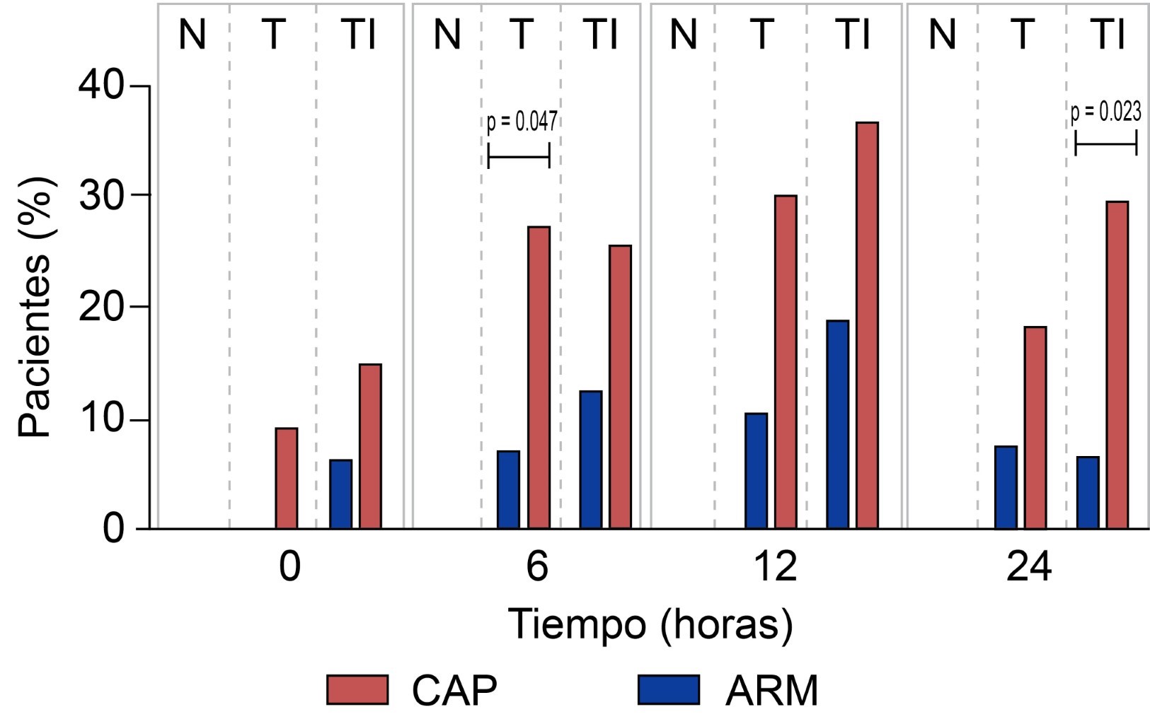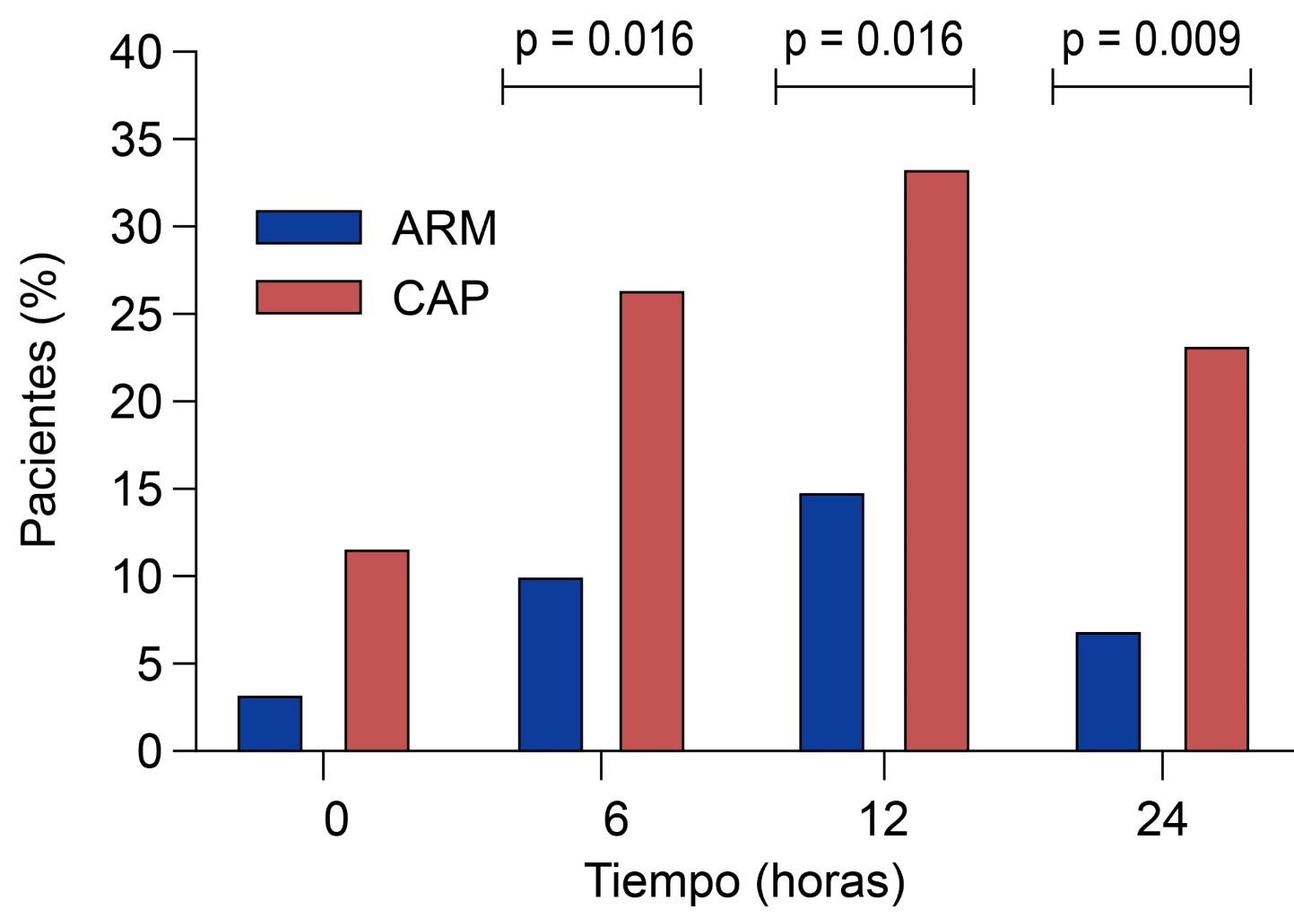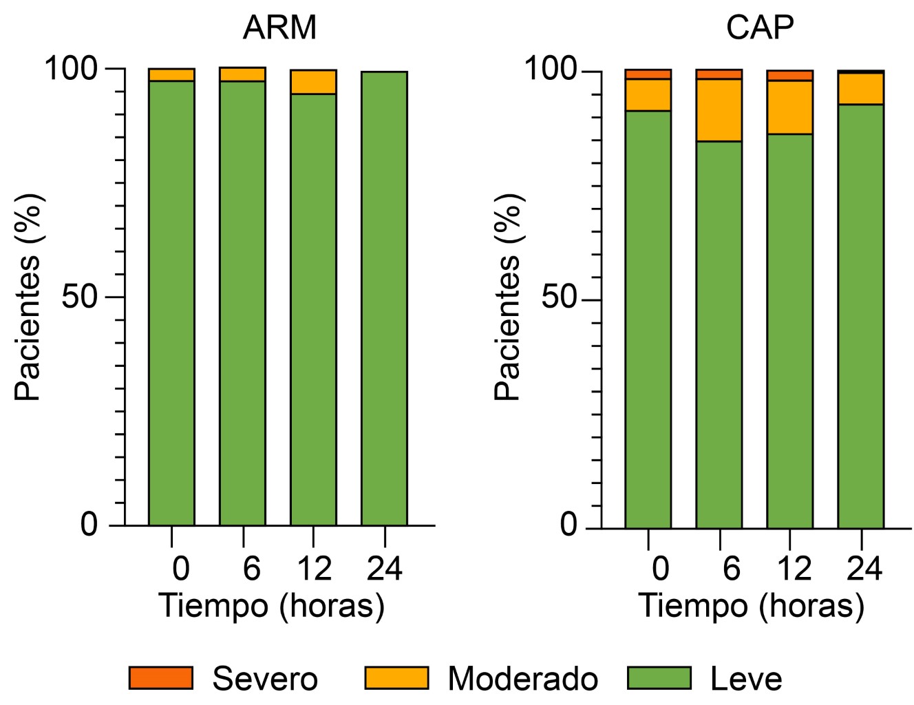 Results: at 6 hours postoperatively, 15% of the CAP group reported severe pain, while none in the ARM group experienced severe pain (p = 0.007). The incidence and severity of PLSP were significantly lower in the ARM group at all time points (p < 0.05).