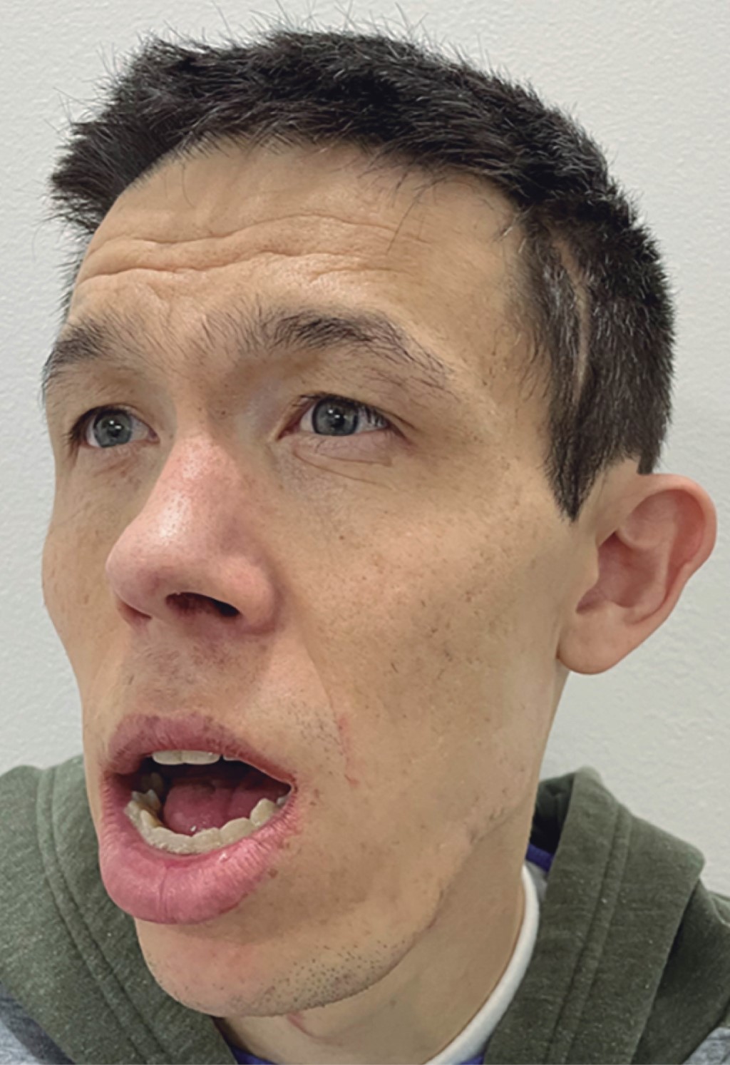Since his diagnosis, he was followed a sugar-free and fluoride-free diet, and his behavior has improved. His mother and other family members ensure that he has daily baths and oral care at least twice daily. He receives dental care at a clinic every six months, with mobility restrictions managed by the oral hygienist and family members. Currently, he primarily receives medical care from an endocrinologist and a neurologist. He takes 15 mg of mirtazapine daily, 300 mg of carbamazepine in the morning, and 400 mg at bedtime, and he receives a monthly intramuscular injection of 125 mg of testosterone enanthate to address his low testosterone levels.
