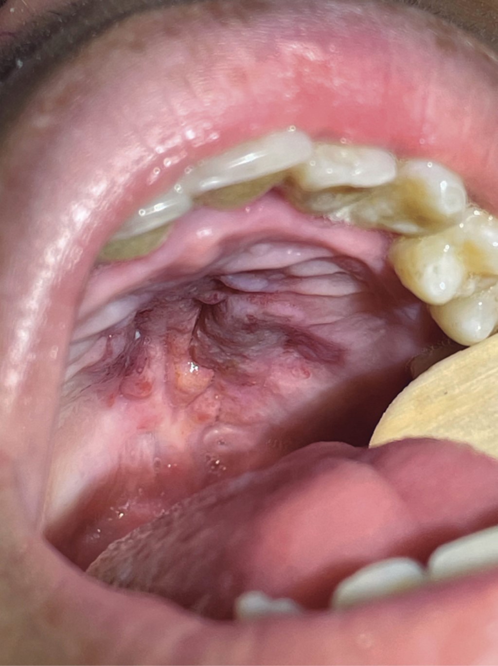 The hard palate can be affected by various conditions. Due to the inherent circumstances of the patient with AS, information about the origin of his palatal lesion was limited to questioning his family members. Consequently, a process of elimination was necessary to consider all potential causes of the lesion.
