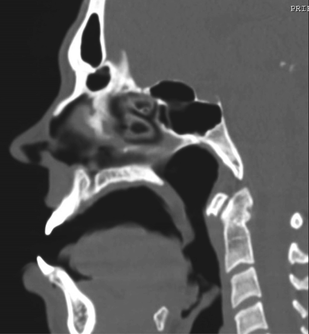 A computed tomography did not show bone erosion, palatal bone pathology, or any other pathologies in the surrounding areas that might explain the origin of the palatal lesion (Figure 3).