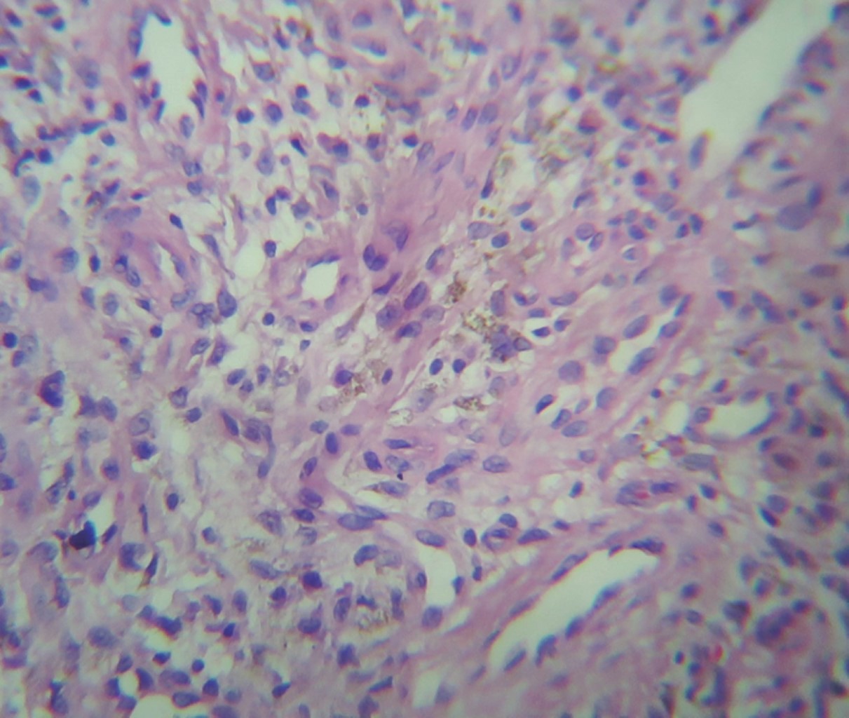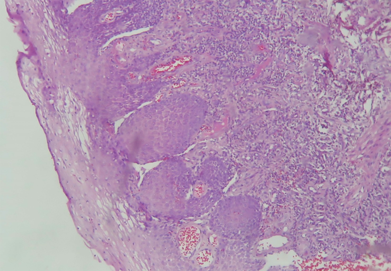 An incisional biopsy was then performed under local anesthesia, with the patient's movements restricted by nurses and family members. A biopsy specimen was examined microscopically, which revealed well-vascularized connective fibrous tissue with chronic inflammatory infiltrate consisting of macrophages, histiocytes, plasma cells, and lymphocytes, thick collagen fibers arranged irregularly, and evidence of recent and old hemorrhage, which was partially covered by parakeratinized stratified squamous epithelium with spongiosis. These findings indicated a chronic inflammatory process involving old hemorrhage and fibrosis (Figures 4 and 5).
