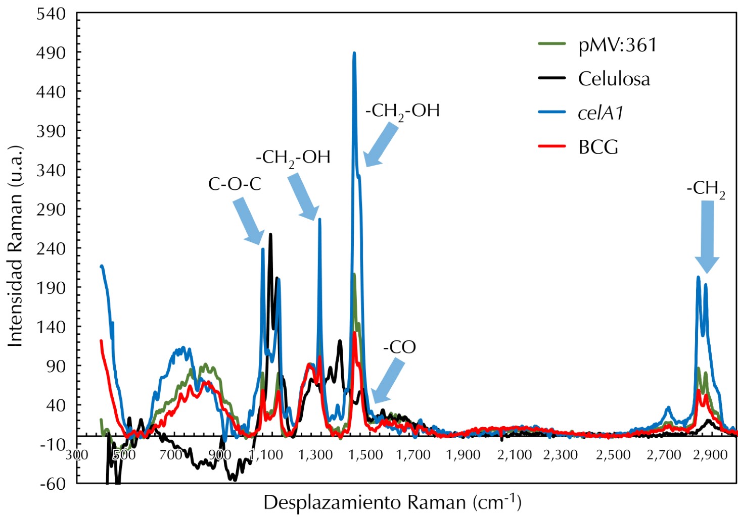 Introduction: biofilms are complex communities of microorganisms that adhere to each other and form an extracellular matrix that provides protection against antibiotics and the host's immune system, contributing to the chronicity and treatment resistance of diseases, such as tuberculosis. Similar structures to in vitro biofilms have been found in the lungs of animal models infected with Mycobacterium tuberculosis, which could increase the difficulty of treatment and the risk of relapse. This study explores the production of cellulose by Mycobacterium bovis BCG, including a recombinant strain that overexpresses the cellulase encoding gene celA1, and analyze them by Raman spectroscopy. The importance of understanding the interaction between cellulose and mycobacteria in developing therapeutic strategies and biotechnological applications is highlighted. Objective: to identify the presence of cellulose using Raman spectroscopy. Material and methods: cultures of Mycobacterium bovis BCG Pasteur ATCC 35734 strain, as well as a recombinant strain that overexpresses the cellulase-encoding gene celA1, were carried out in Sauton medium without detergent, to promote autoaggregation and biofilm formation; material was extracted using a bacterial cellulose protocol and Raman spectra were compared to those of commercial cellulose. Results: although differences are observed in the resolution and location of some peaks, those characteristic of cellulose confirm its presence in the strains under study. Conclusion: through Raman spectra analysis, we found that Mycobacterium bovis BCG produces cellulose in cultures in Sauton medium without detergent, since its spectra show similarities to those of commercial microcrystalline cellulose.REFERENCES