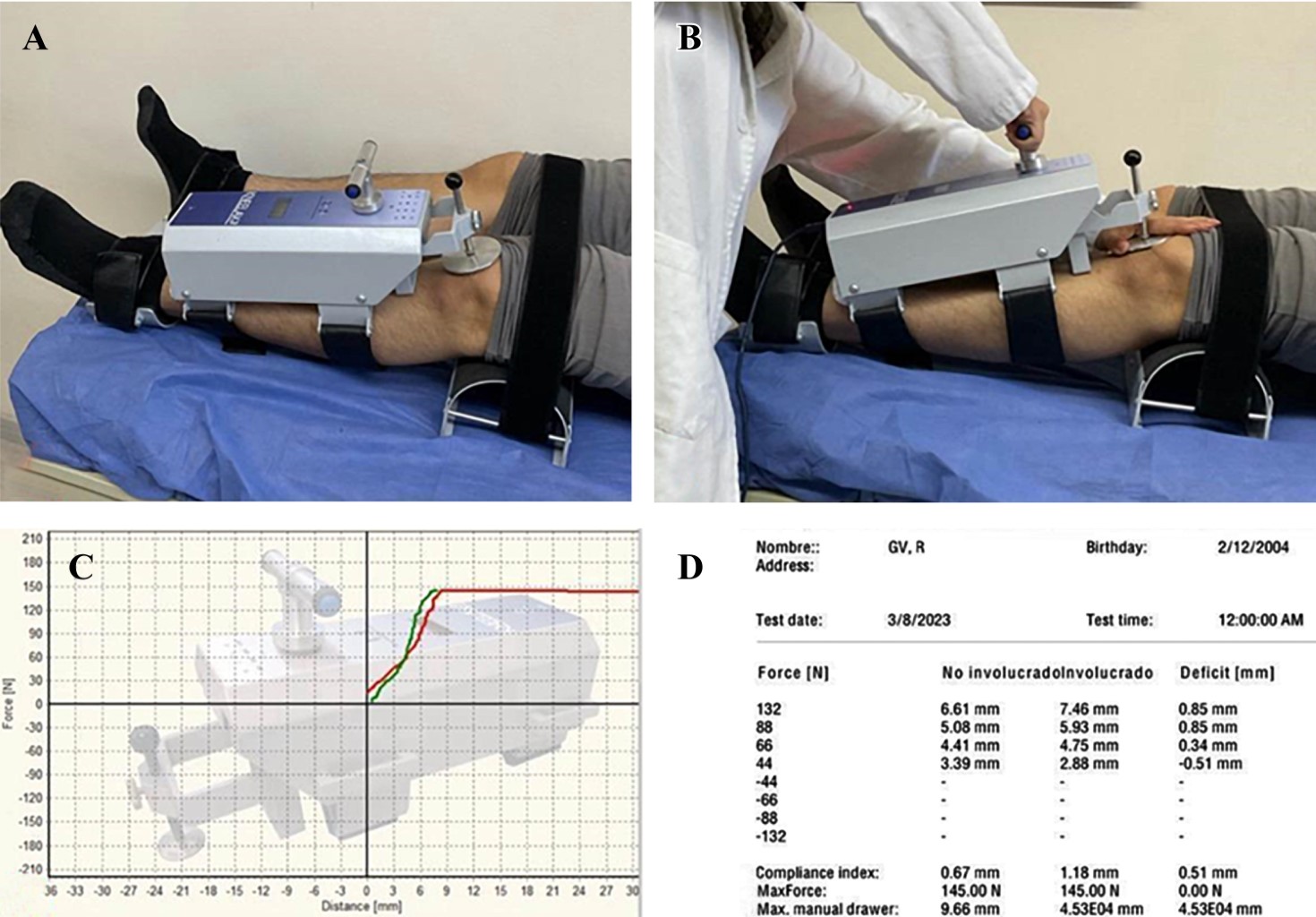 Anterior tibial translation assessment: anterior tibial translation relative to the femur was measured using the KNEELAX 3® arthrometer. Participants were positioned in a supine decubitus position with the knee in 30° of flexion and secured with a velcro brace for stability.27 An anterior tibial traction force was applied to assess anterior displacement in both lower limbs at forces of 40, 60, 88, and 132N (Figure 2). The recorded values were documented for analysis.28