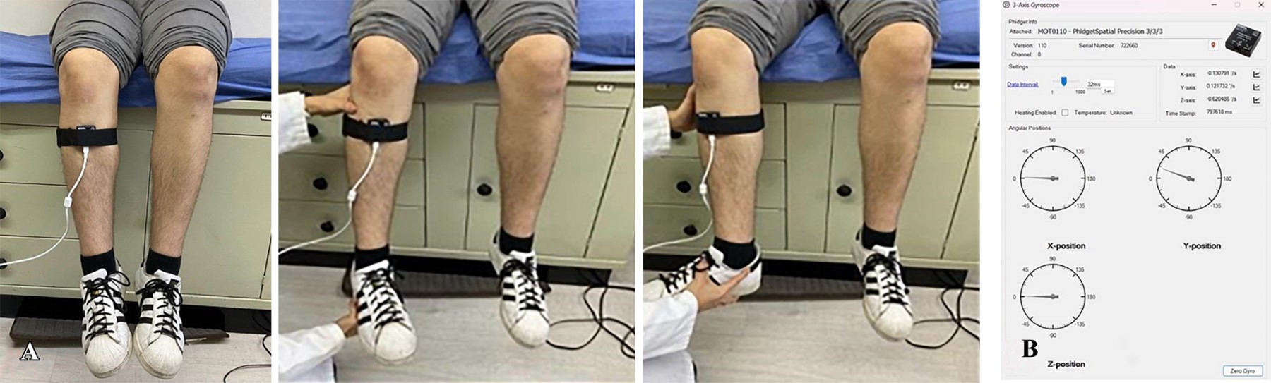 Internal and external tibial rotation were measured using PhidgetSpatial Precision inertial sensors,29,30 positioned 5 cm below the patella at the midline. Controlled rotational movements were performed, and data were recorded using specialized software (Figure 3).