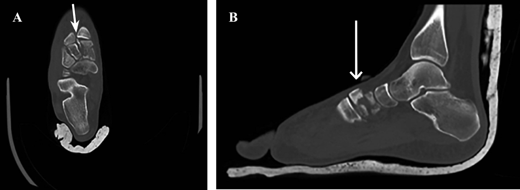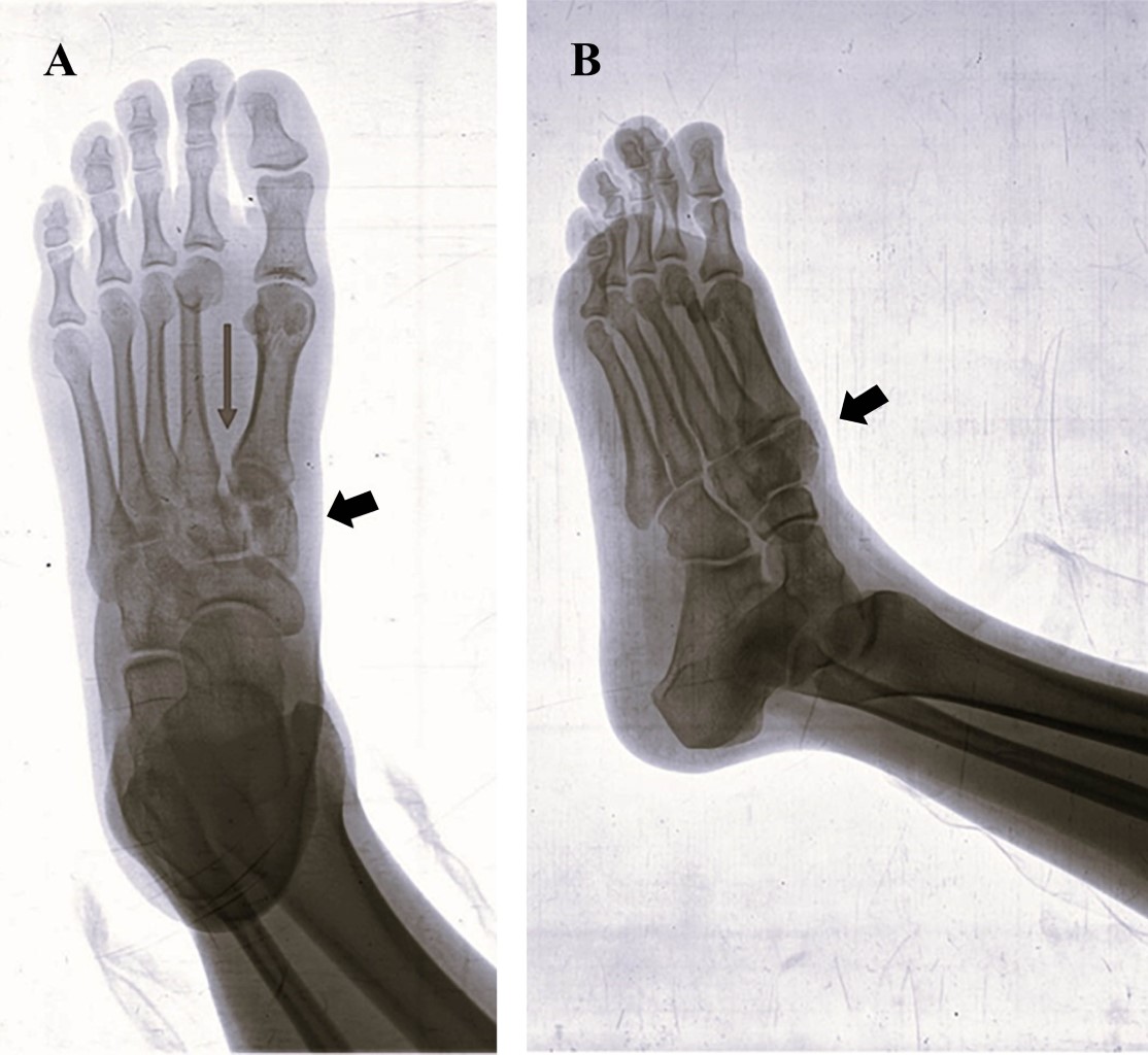 Akan B, Yildirim T. Dorsal dislocation of the intermediate cuneiform with a medial cuneiform fracture: A case report and review of the literature. Case Rep Orthop. 2013; 2013: 238950. doi: 10.1155/2013/238950.