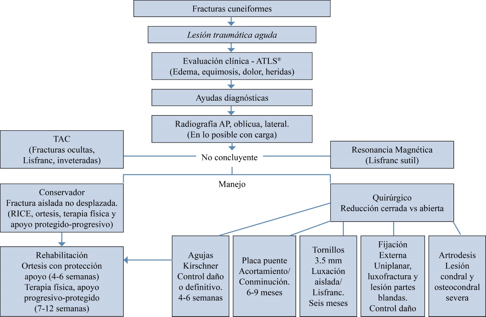 Introduction: fractures and dislocations of the cuneiform bones represent a diagnostic and therapeutic challenge due to their low incidence and anatomical complexity. The objective of this work focuses on the clinical relevance of the Roman arch of the midfoot and its susceptibility to injuries from direct and indirect trauma.