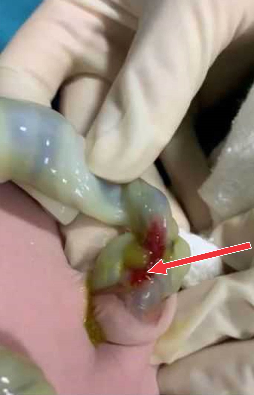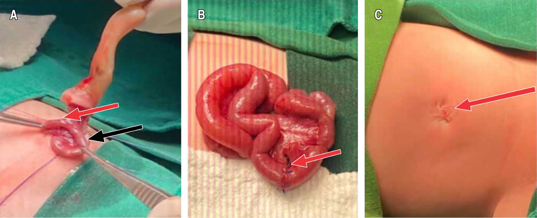 Clinical case: a male newborn was found at birth with meconium-stained umbilical cord blood. The remnant of the omphalomesenteric duct was confirmed by contrast fistulography. Surgery was performed with resection of an intestinal segment around the omphalomesenteric fistula, followed by an ileoileal end-to-end anastomosis. The patient was discharged home after 10 days due to a good recovery.