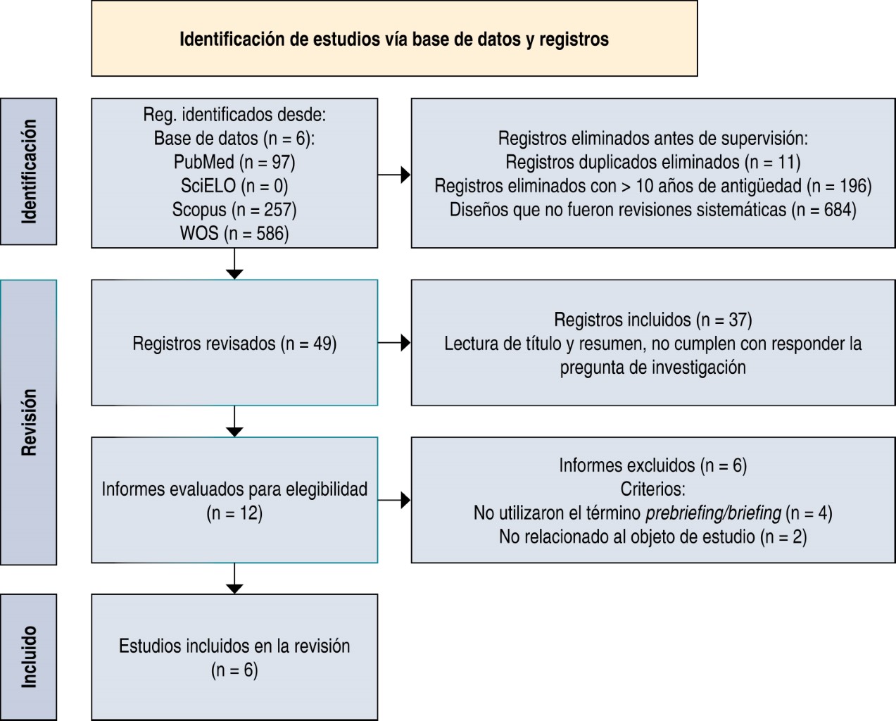 Material and methods: the PRISMA-ScR protocol was followed, reviewing databases such as Scopus, Web of Science, PubMed and Scielo using the terms "prebriefing" OR "briefing" AND "training, simulation" between February and April 2025. Quality was assessed using the AMSTAR-2 instrument.