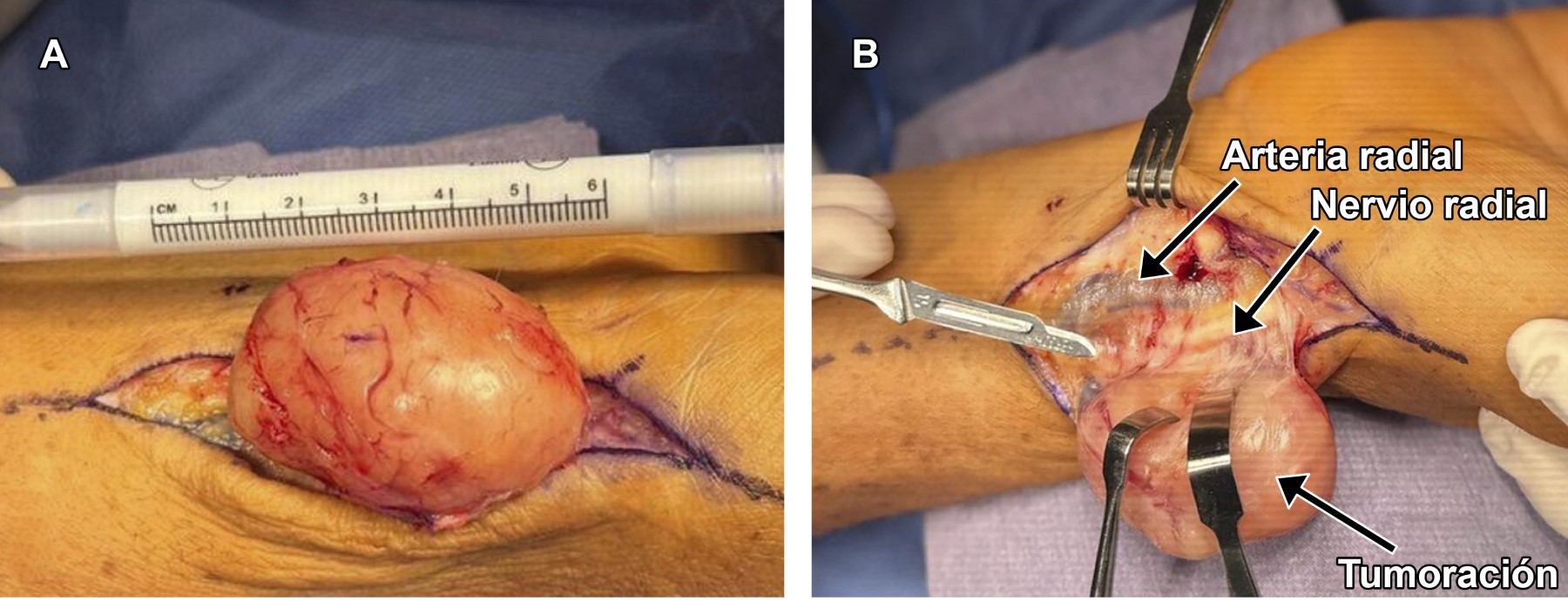 Introduction: Schwannomas are benign nerve sheath tumors that are rare in the radial nerve. Case report: a 62-year-old man presented with a mass in the distal right radius with a 5-year history of progression and associated paresthesias. Ultrasound revealed a well-defined, heterogeneous, and vascularized lesion. Surgical resection was performed without complications, and histopathology confirmed a schwannoma. Conclusion: due to its slow growth and encapsulated nature, the ideal treatment is complete excision. This case highlights the importance of early diagnosis and appropriate surgical management to prevent neurological sequelae.REFERENCES
