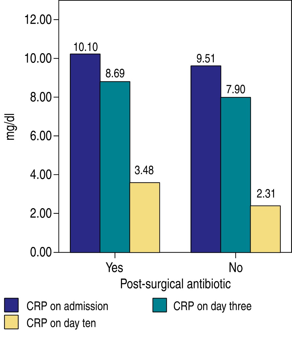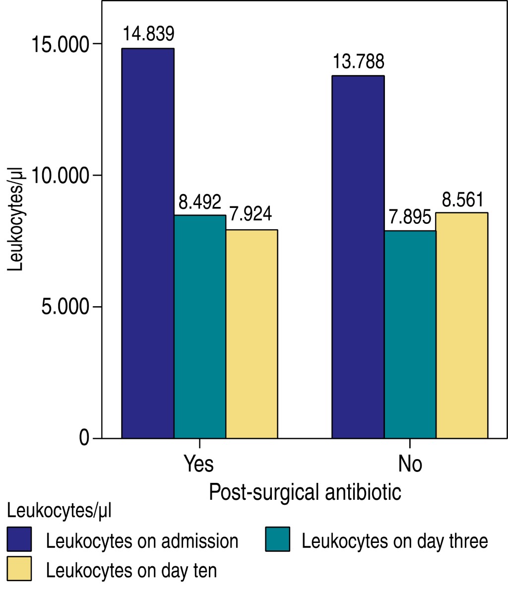 A 95% confidence level (alpha = 0.05). They all signed informed consent. They were divided into two groups in a simple randomized way, (Table 1). Group I, cases without postoperative antibiotics (31 men and 33 women), and control group II (27 men and 37 women) with postoperative administration of a third-generation cephalosporin or a quinolone (in case of history of allergies) for 24 hours after surgery and oral antibiotics for seven days. Leukocytes and C-reactive protein (CRP) were measured on admission, and on the third and tenth days after surgery (Figures 1 and 2). Only those patients with clinical signs of surgical site infection, pneumonia, urinary tract infection, or other remained hospitalized. Comparative analysis was carried out with IBM© SPSS© Statistic V23 software. χ2 test and Mann-Whitney U were done.