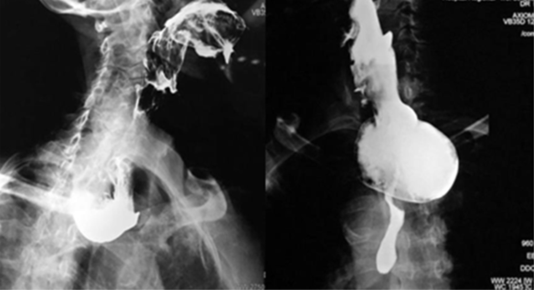 A total of 18 procedures were done, and only one patient (7.1%) was considered a complication. Two patients had subcutaneous emphysema (a 74-year-old female and a 57-year-old male), treated conservatively by administering a third-generation cephalosporin, as well as radiographic control to monitor the emphysema (Figure 6). There were no major complications such as mediastinitis, bleeding, or perforation that required conversion to open surgery. The improvement of dysphagia in all cases was immediate and in subsequent consultations, they reported weight gain. Endoscopy and swallowing of contrast material were performed as controls (Figure 7).