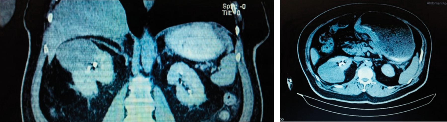 The right renal region was explored and scarce citrine free fluid was found, with a solid tumor in the upper pole of the right kidney, measuring 10 × 5 cm, and a renal vein without thrombus. The renal tumor was assigned a staging of T2bN0M0. During the same surgical procedure, a radical right nephrectomy was done.