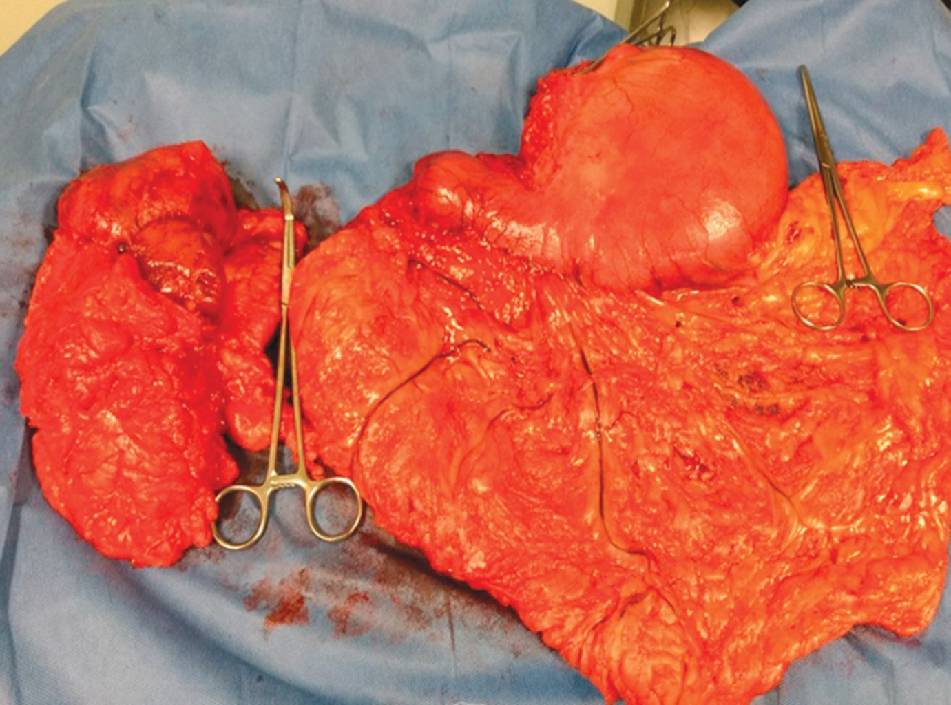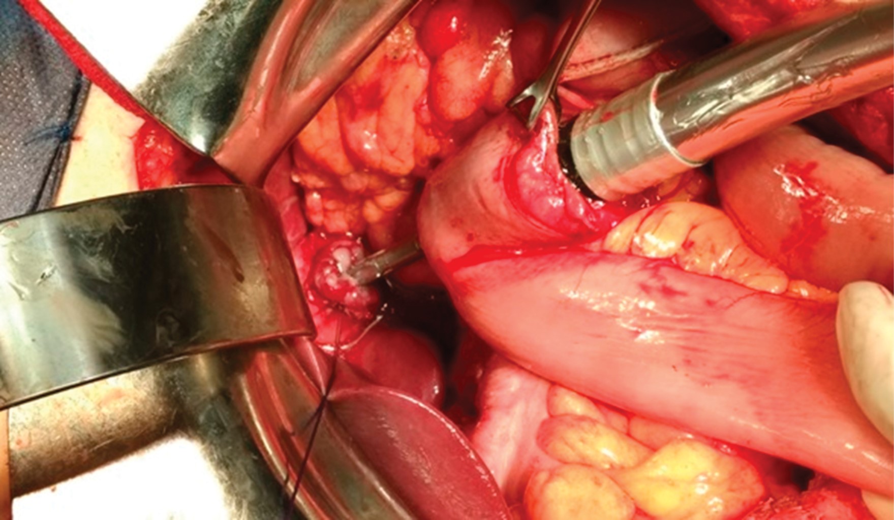 A tumor was found in the lesser curvature of the stomach, the antrum, and pylorus, with extension towards the celiac trunk, including the left gastric artery and the hepatic artery up to the gastroduodenal artery. It also extended to the posterior aspect, with adherences to the body of the pancreas, tumor implants in the transverse mesocolon near the angle of Treitz, and adenomegaly in the greater omentum. The esophagogastric junction was free of tumor. It was stratified as T4aN2M0.