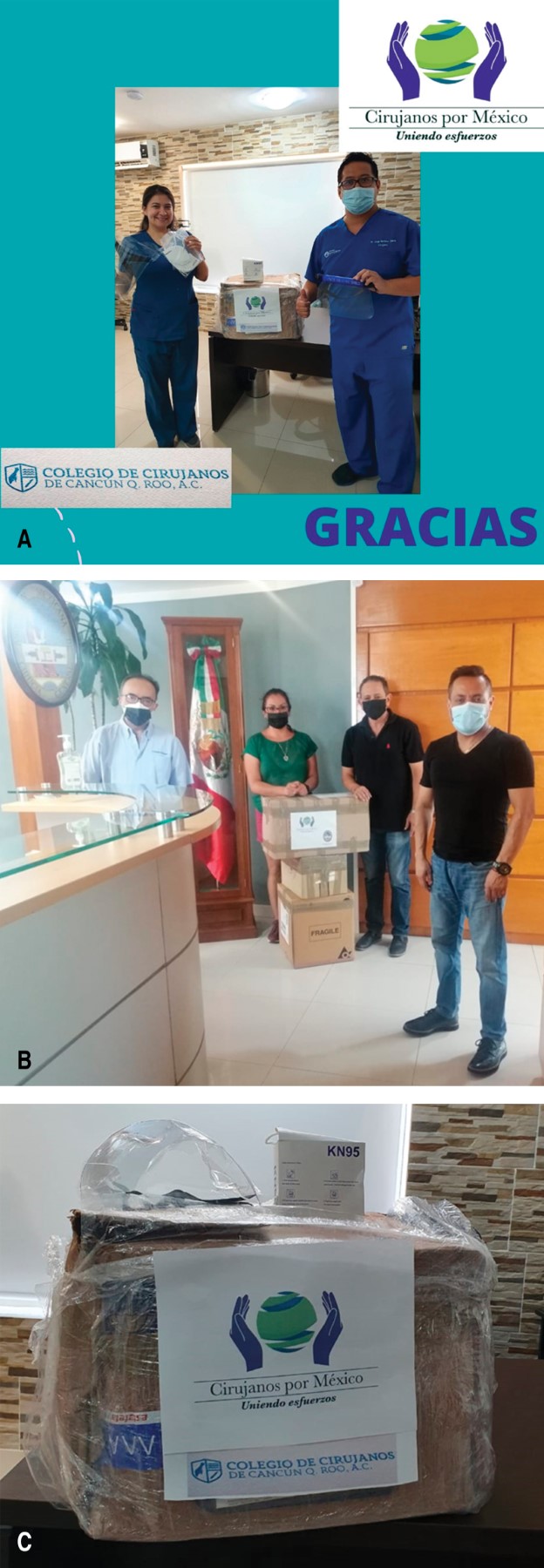 As a medical association we planned to collaborate with the help of a foundation, so we launched a campaign to raise resources and thus obtain protective equipment. To date, we have been able to support more than 900 frontline physicians and their nursing staff (Figures 1A-C and 2).