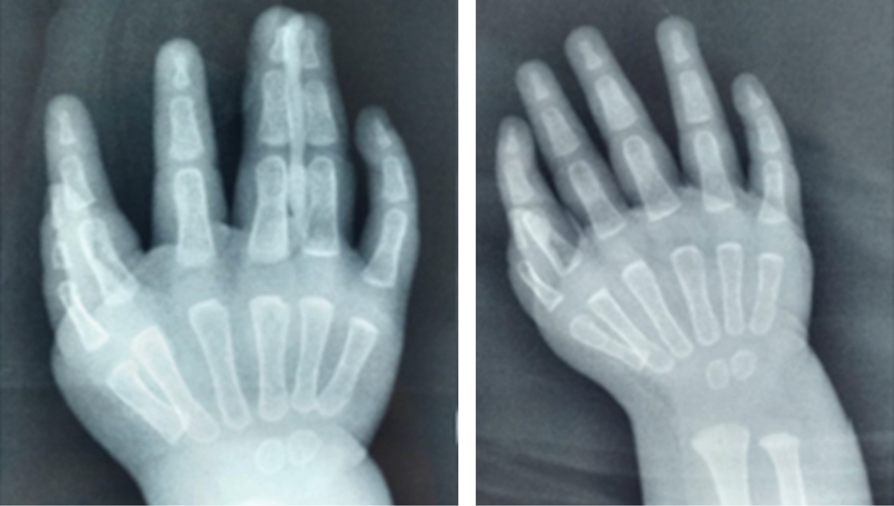 Physical examination presented (Figure 1) both symmetrical thoracic extremities, without shortening nor scapular waist or joint elbows deformities, with posterior hypoplastic forearm musculature, without limitation for prone-supination, both wrists in flexion pose at 40o, limited to 20° extension. The hands with the presence of 6 fingers in both hands in an attitude of flexion, presenting three post-axial triphalangeal fingers and three preaxial, morphologically normal. The examination shows complete mobility arches in shoulders and elbows, without joint instability, with limitation in both wrists (palmar flexion of 75°, dorsal extension 20°, abduction and adduction 5°), the arcs of mobility of the postaxial fingers was normal, and the preaxial fingers showed complete mobility arcs but decreased strength 4/5 on the Daniel’s scale, without pain. Simple X-rays of both hands were requested (Figure 2), finally integrating the diagnosis of bilateral mirror hand syndrome.